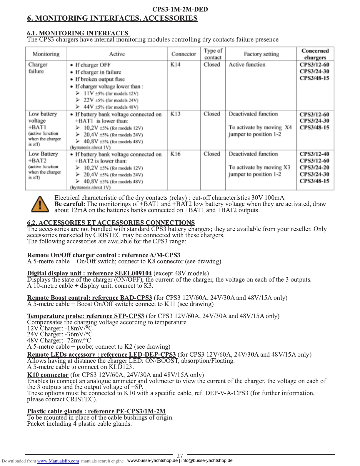 The CPS3 chargers have internal monitoring modules controlling dry contacts failure presence