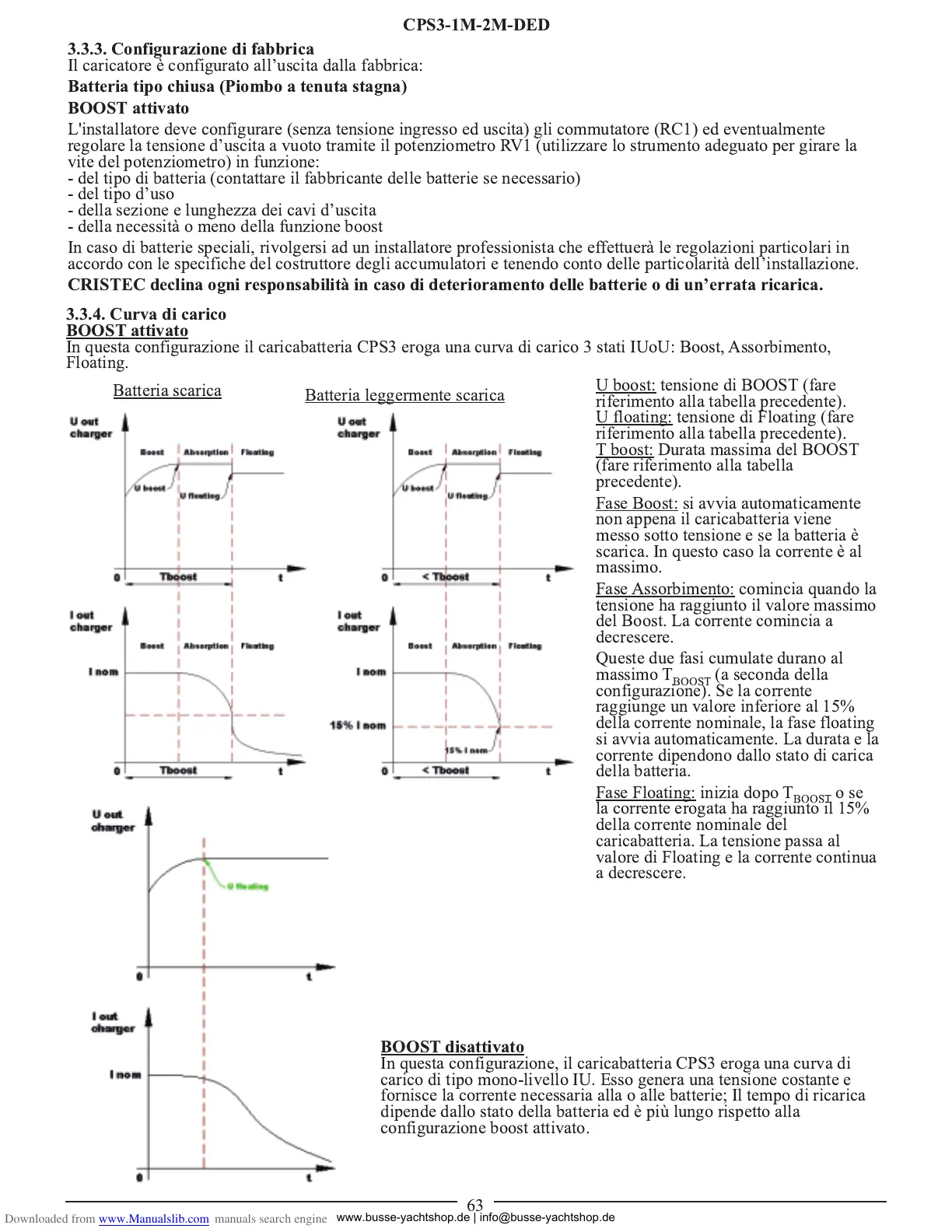In questa configurazione il caricabatteria CPS3 eroga una curva di carico 3 stati IUoU: Boost, Assorbimento,