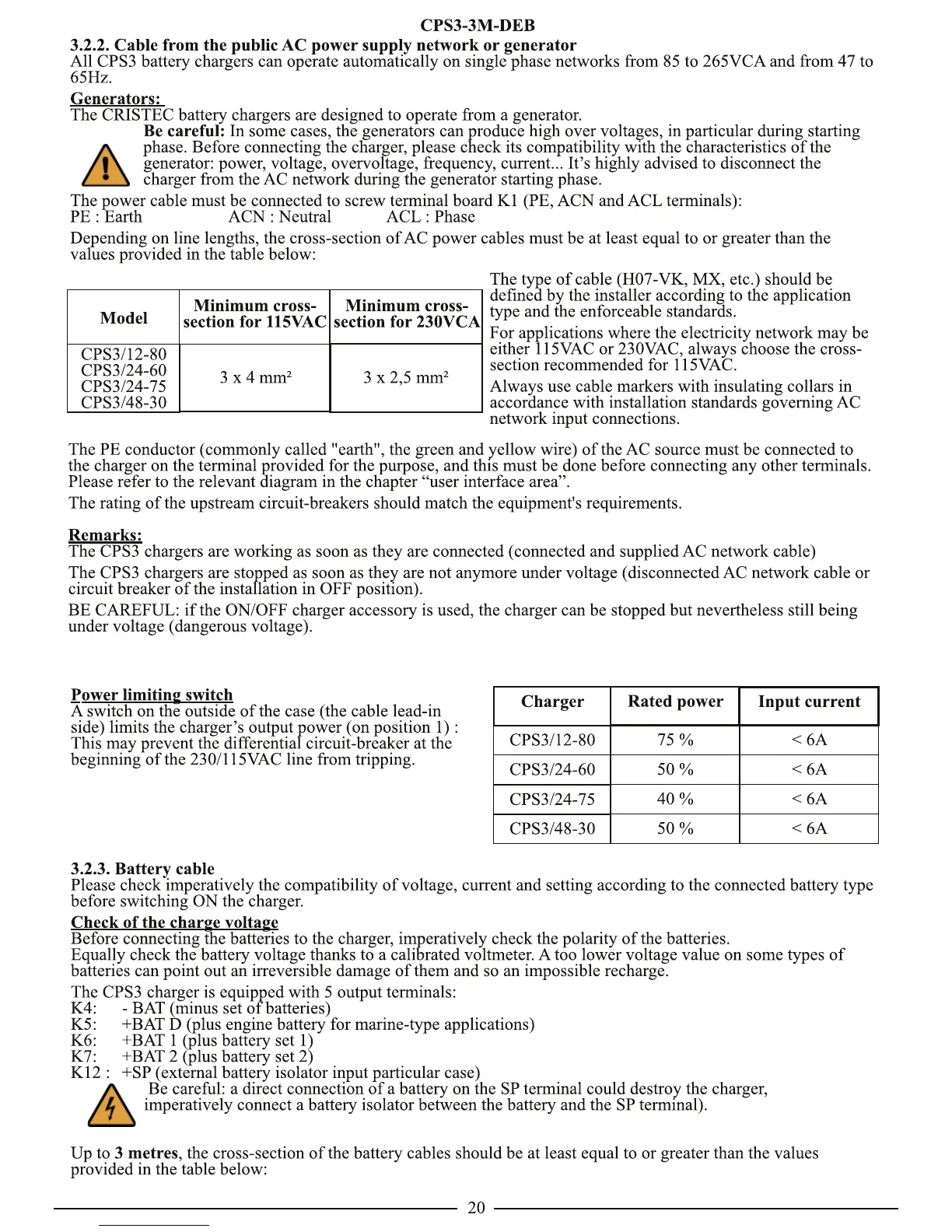 Cristec CPS3 12V/80A - Battery Cable; Generators; Power Limiting Switch; Check of the Charge Voltage