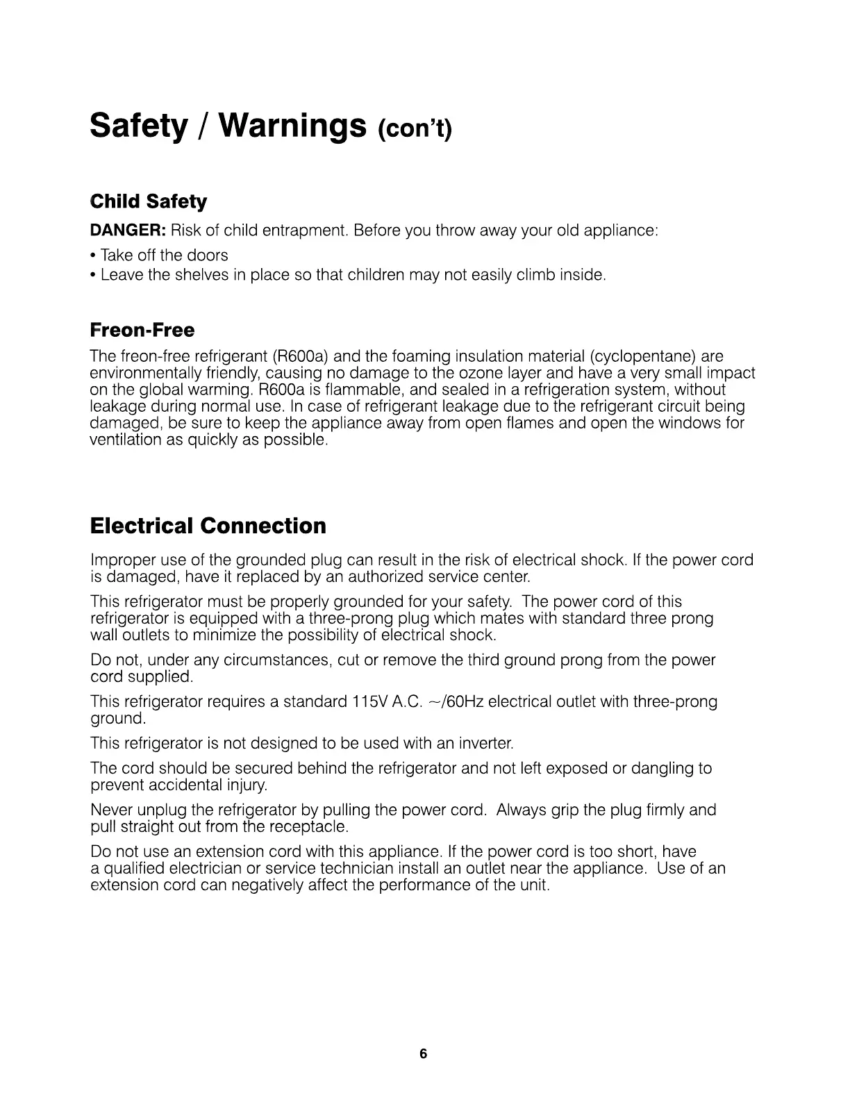 This refrigerator requires a standard 115V A.C. ~/60Hz electrical outlet with three-prong