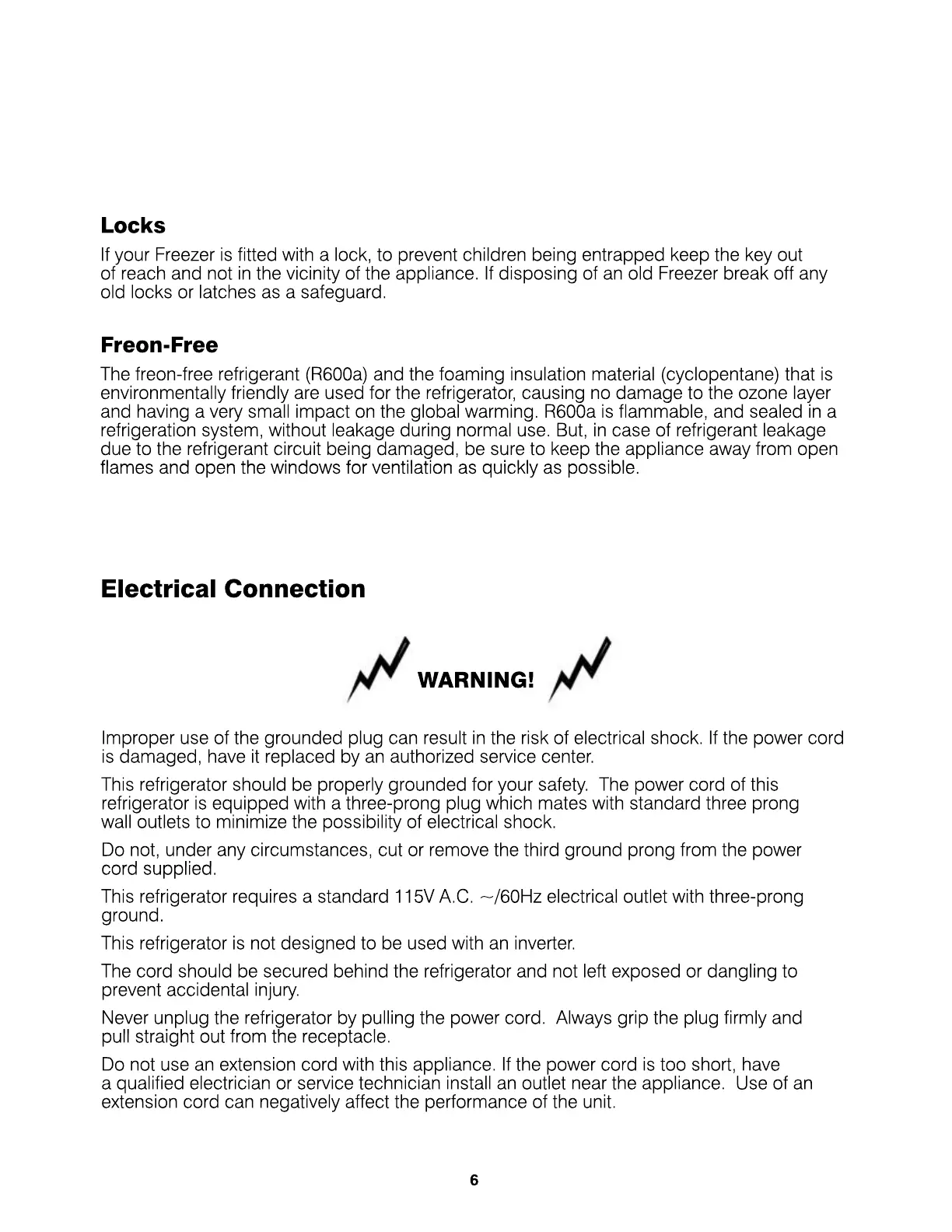 This refrigerator requires a standard 115V A.C. ~/60Hz electrical outlet with three-prong