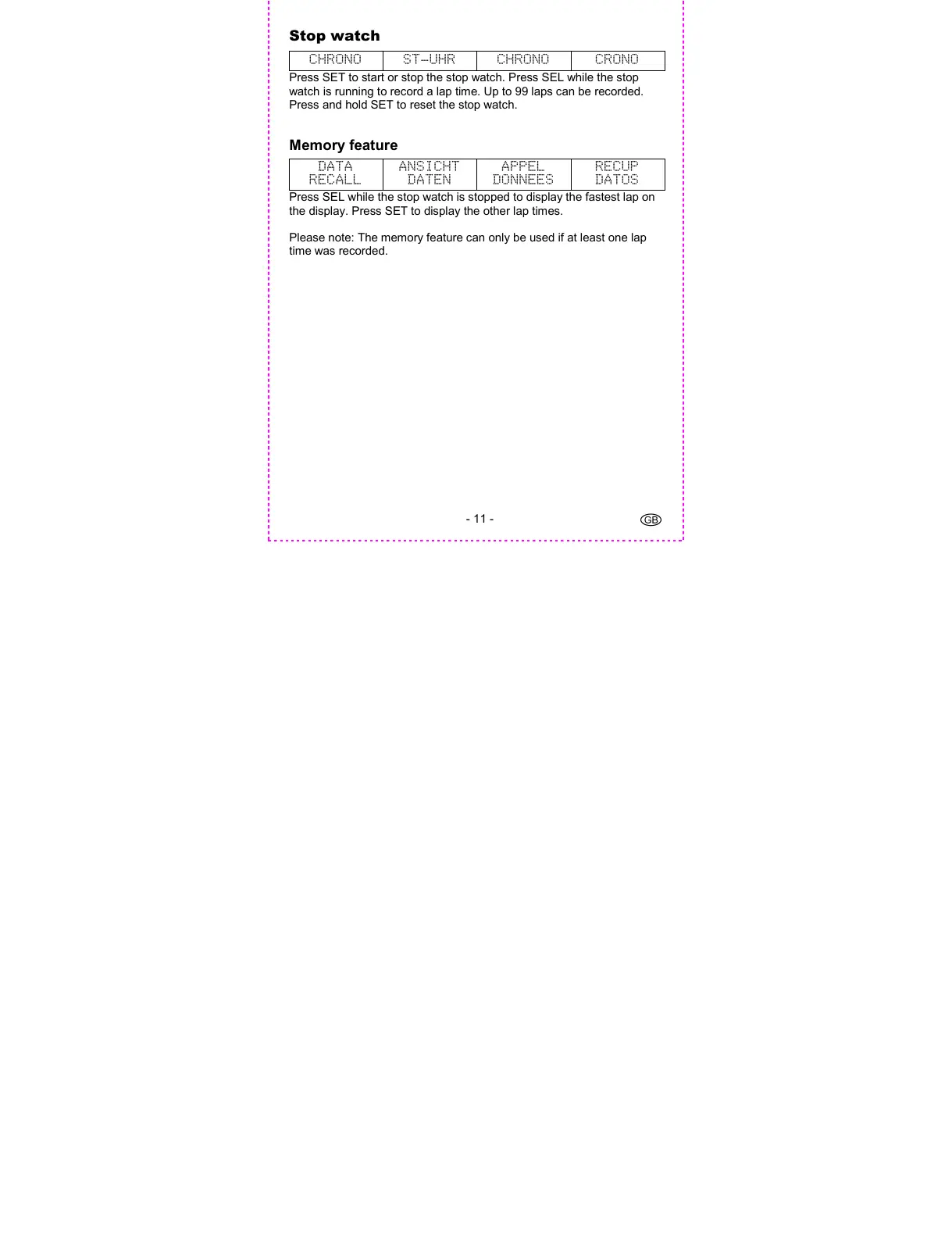 Please note: The memory feature can only be used if at least one lap