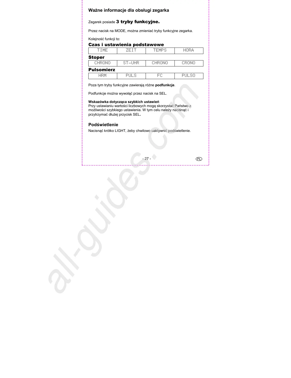 Ważne informacje dla obsługi zegarka