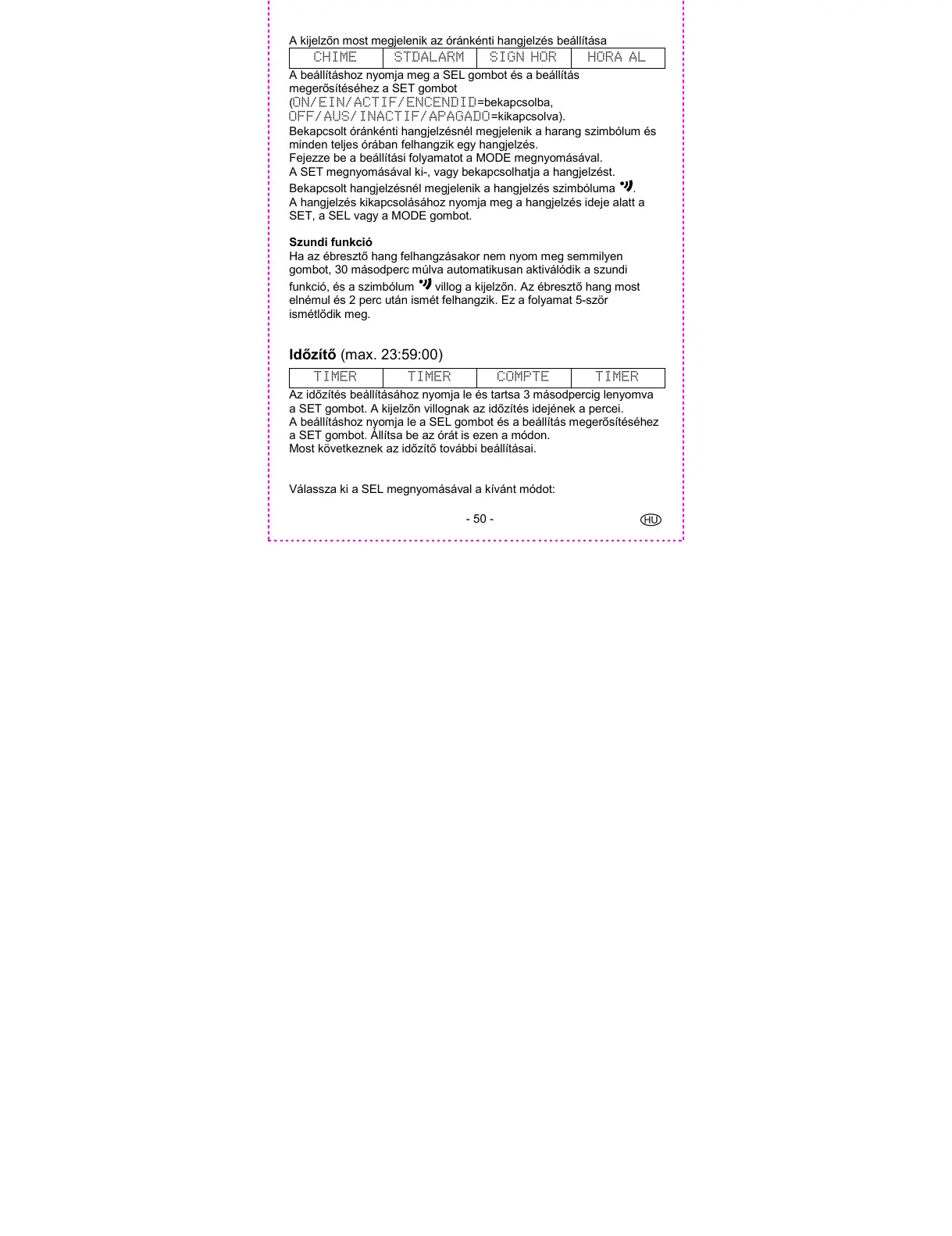 minden teljes órában felhangzik egy hangjelzés.
