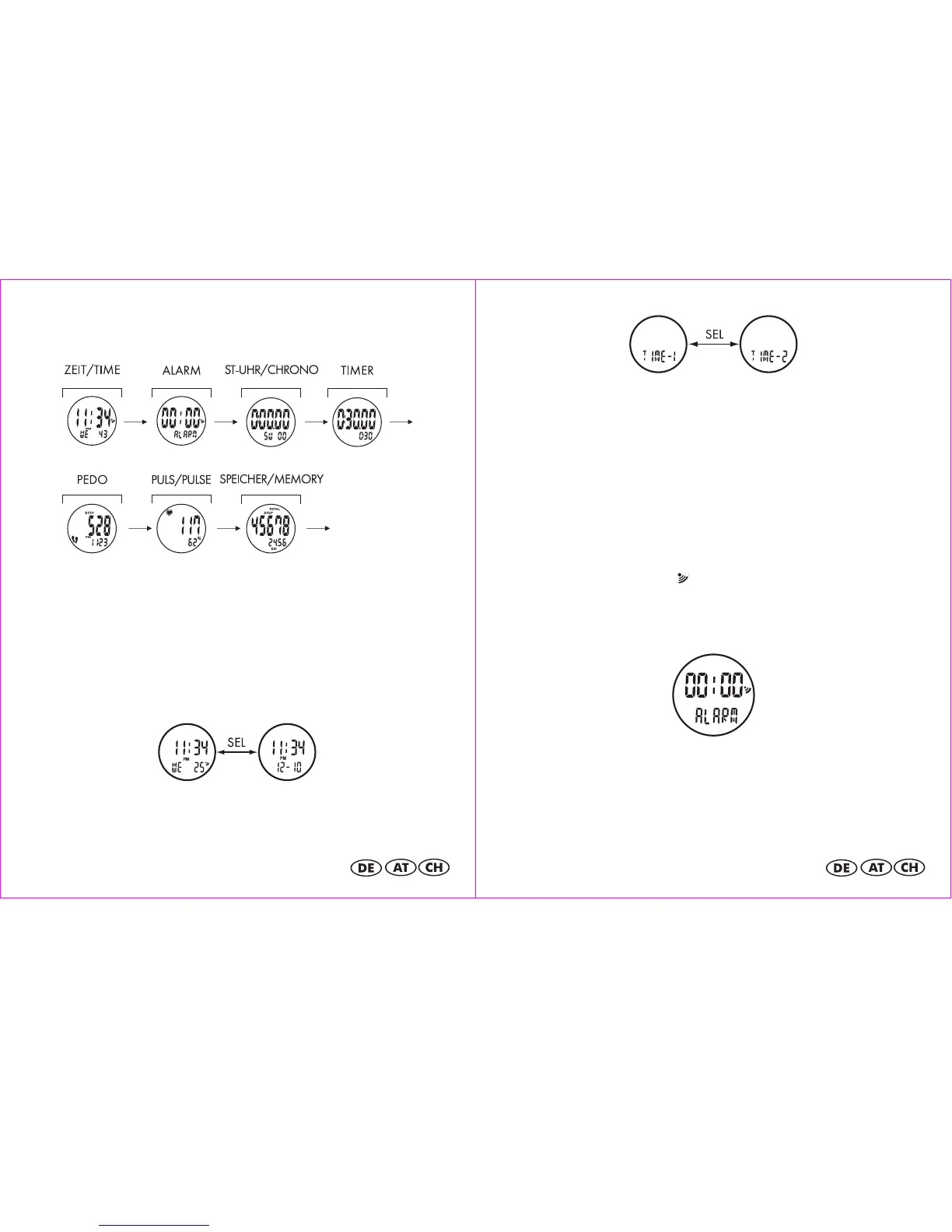 Drücken und halten Sie SEL, um in die 2. Zeitzone (ZEIt 2 / TIME-2) zu wechseln.