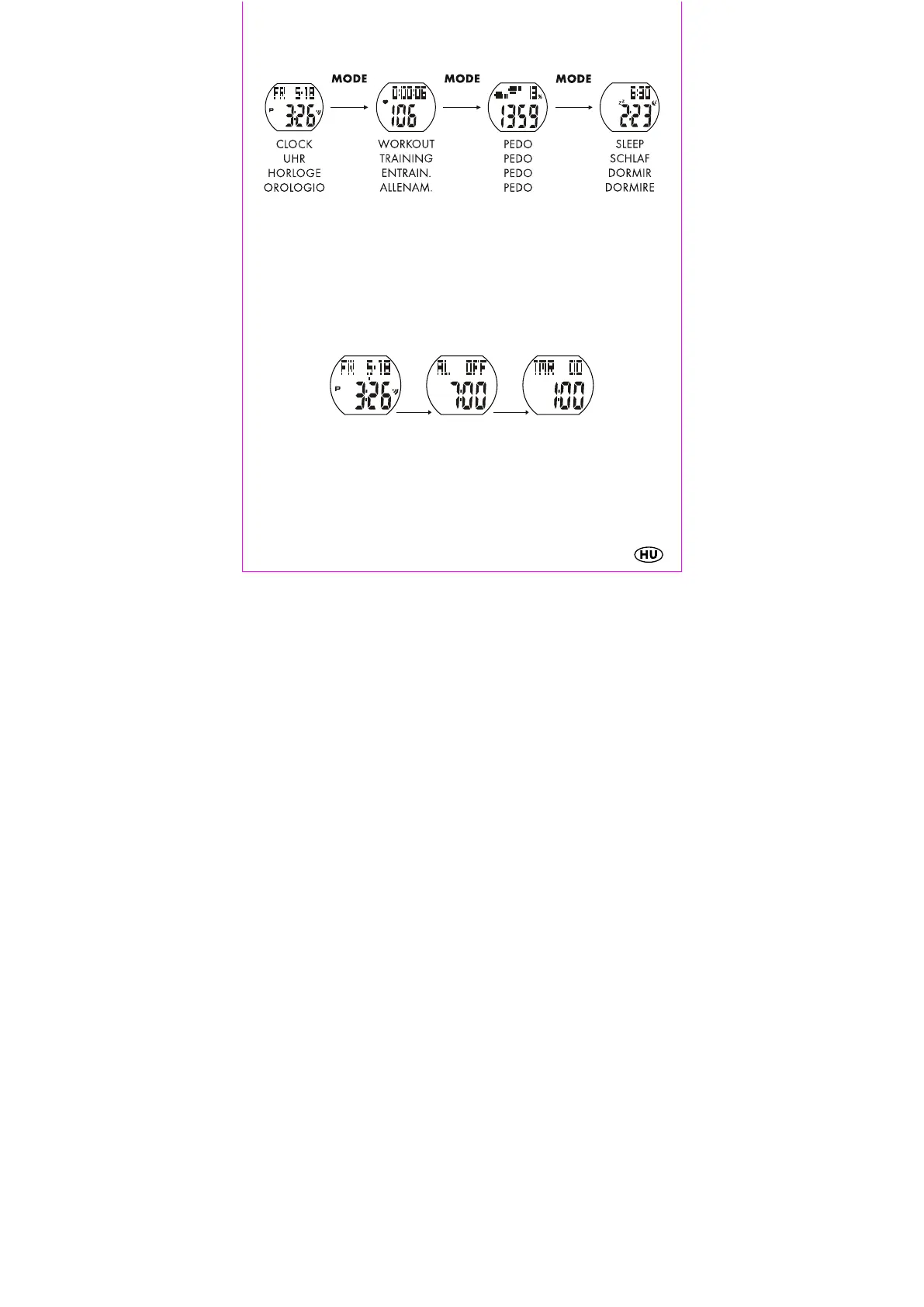Először válassza ki a CLOCK / UHR / HORLOGE / OROLOGIO funkciót a