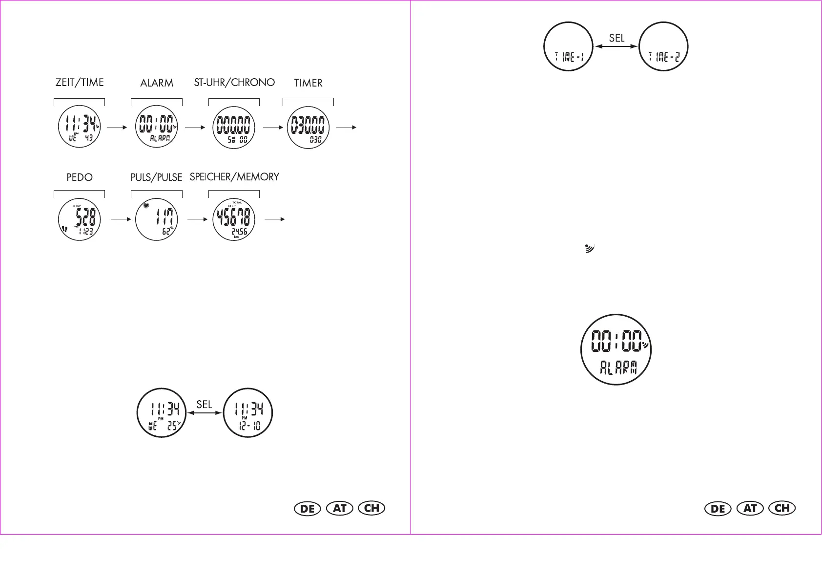 Drücken und halten Sie SEL, um in die 2. Zeitzone (ZEIt 2 / TIME-2) zu wechseln.