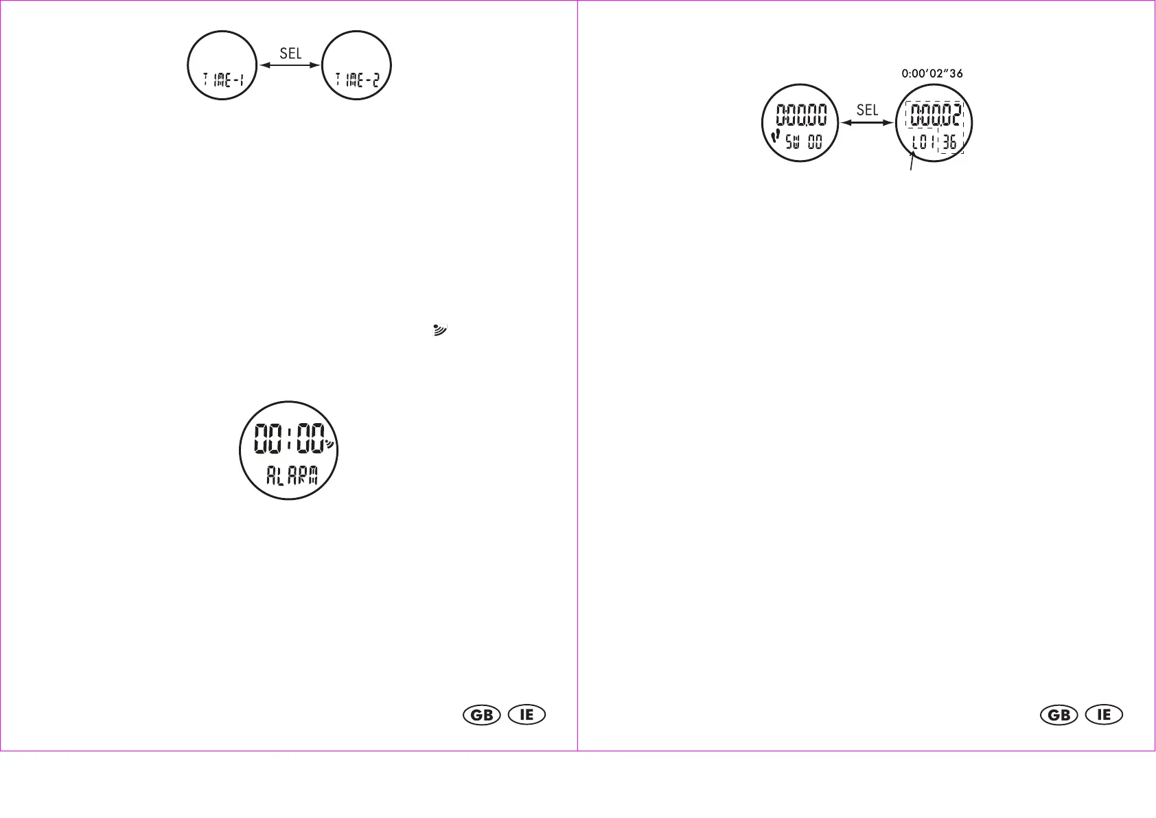 Repeatedly press MODE to select alarm mode (ALARM). Press SEL to activate or
