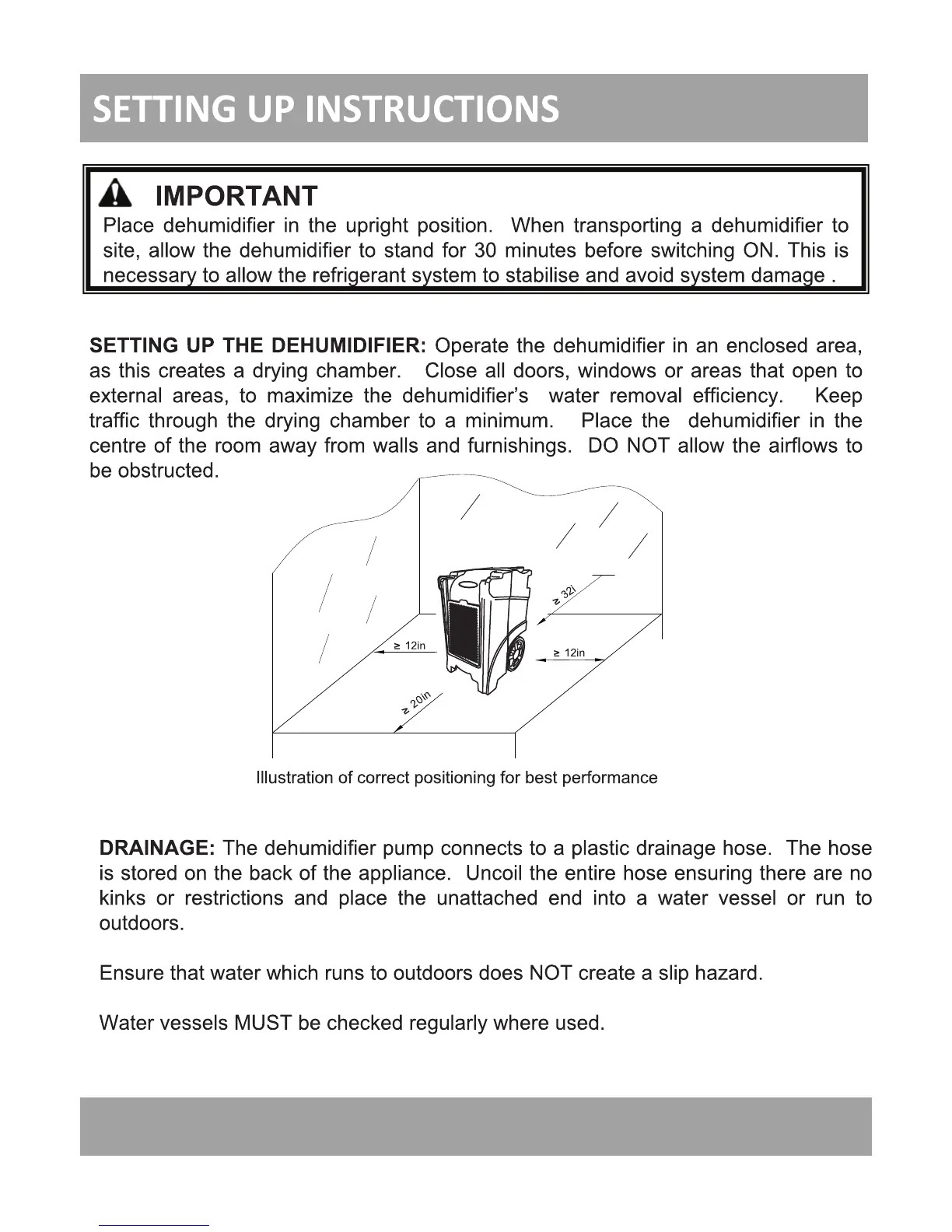 Cromtech AONE90L - Setting Up Instructions; Setting up the Dehumidifier; Drainage