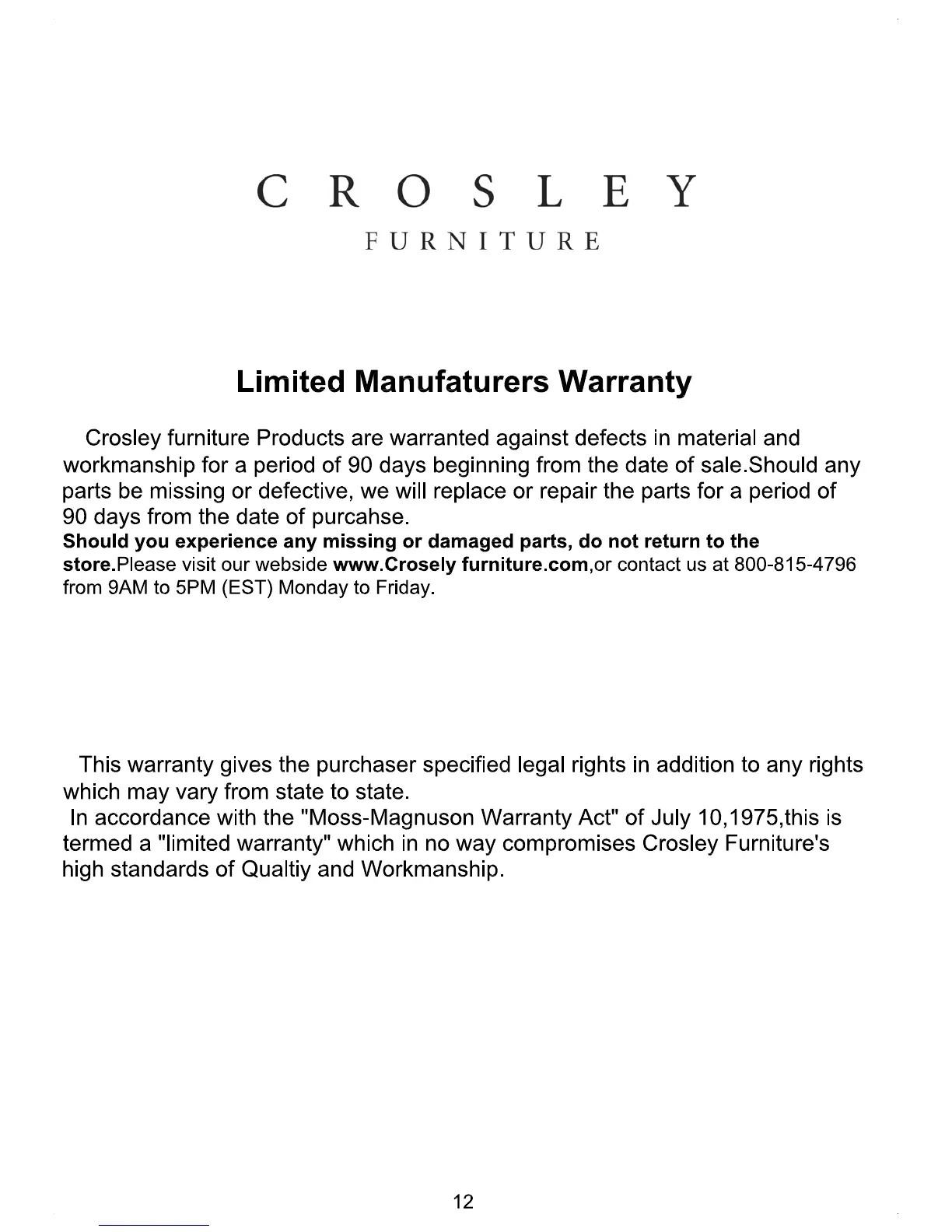 Crosley CF4002 - Limited Manufacturers Warranty