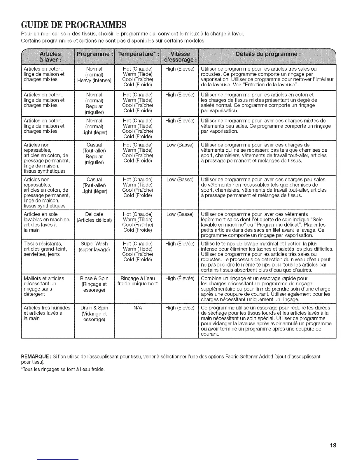 REMARQUE : Si Fen utilise de I'assouplissant pour tissu, veiller & s61ectionnerI'une des options Fabric Softener Added (ajout d'assouplissant