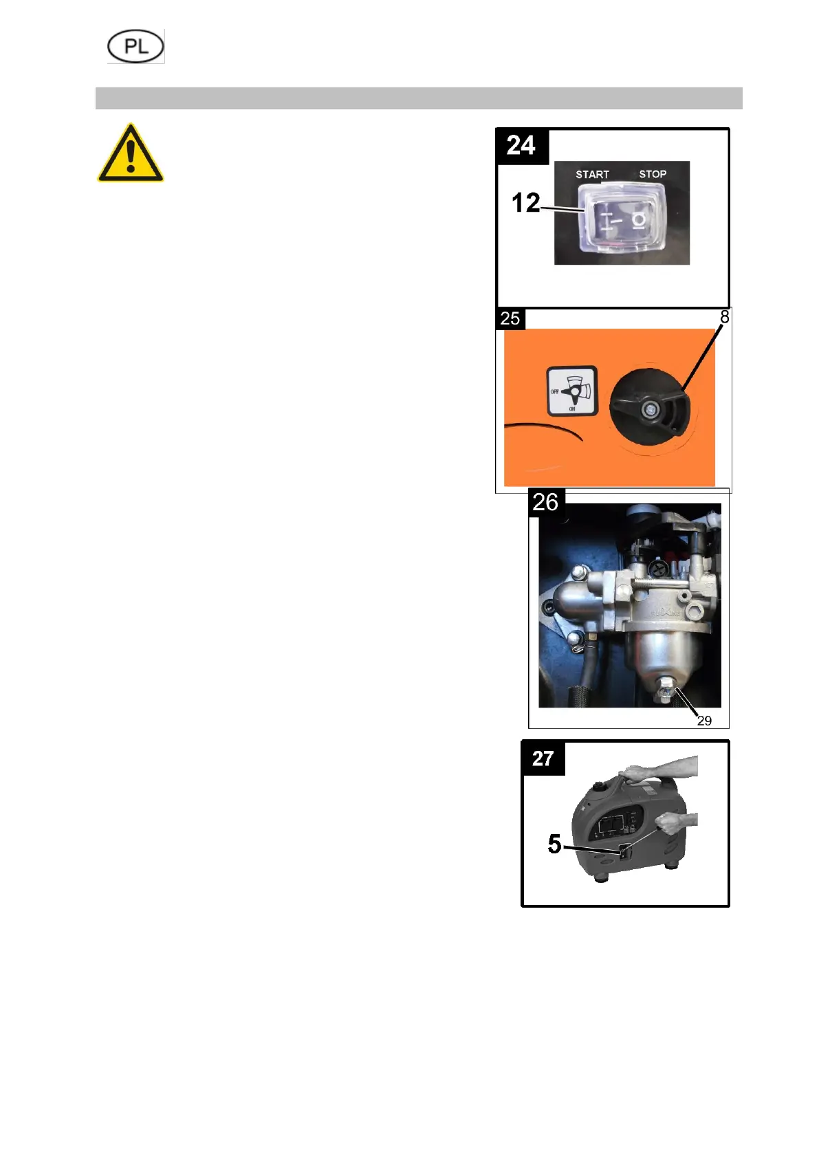 - Odkręcić śrubę spustową (29) gaźnika i opróżnić