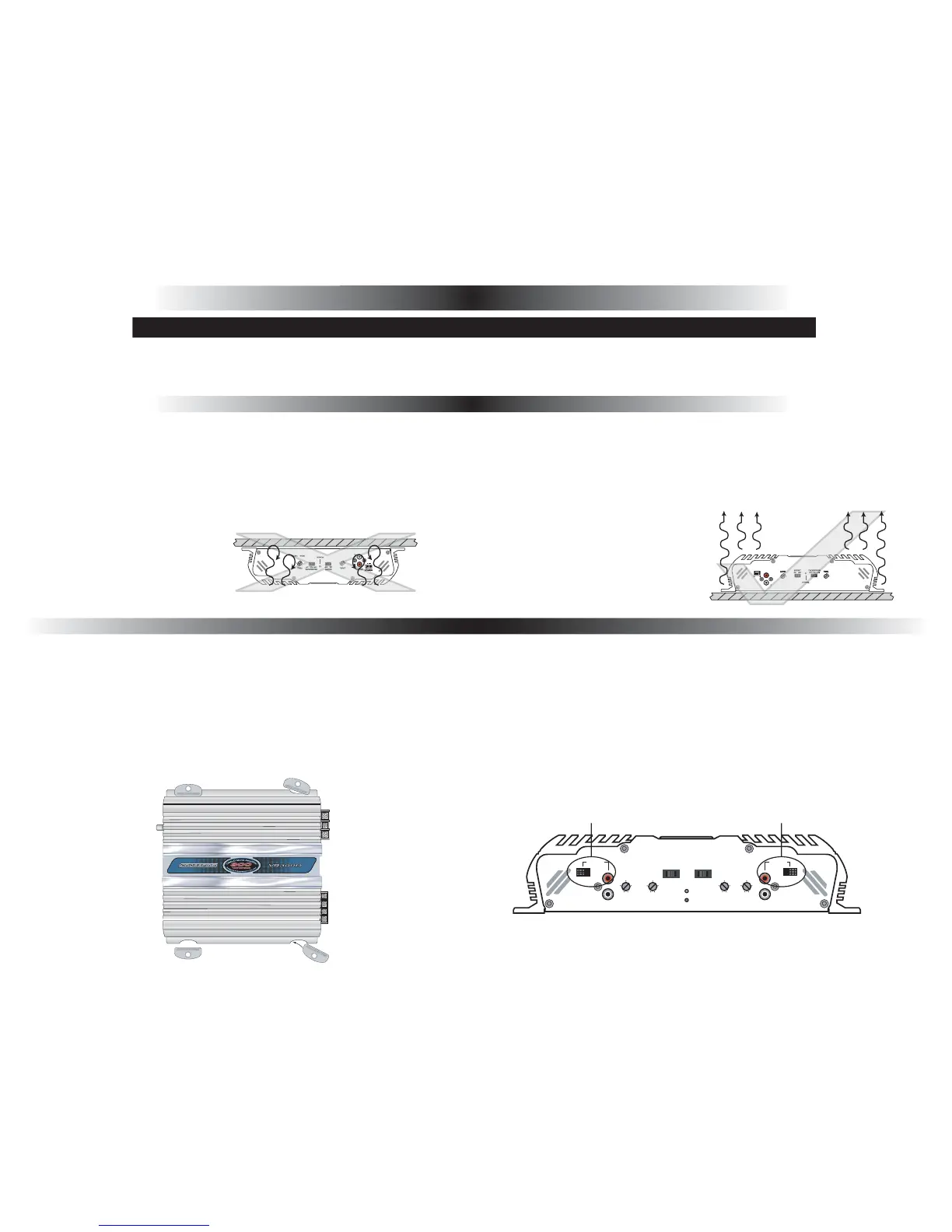 from moisture. Keep in mind that an amplifier should never be mounted upside down. Upside down mounting will compromise heat dissipation through the heatsink and will