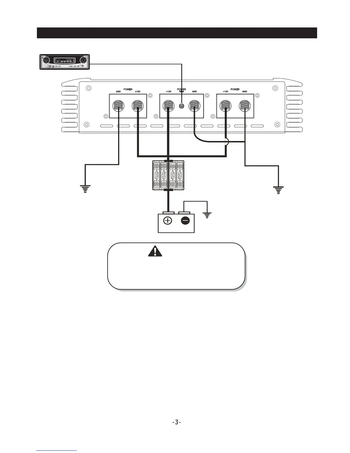 Connect the +12V terminal of the amplier to the positive (+) terminal of the battery using the same diameter