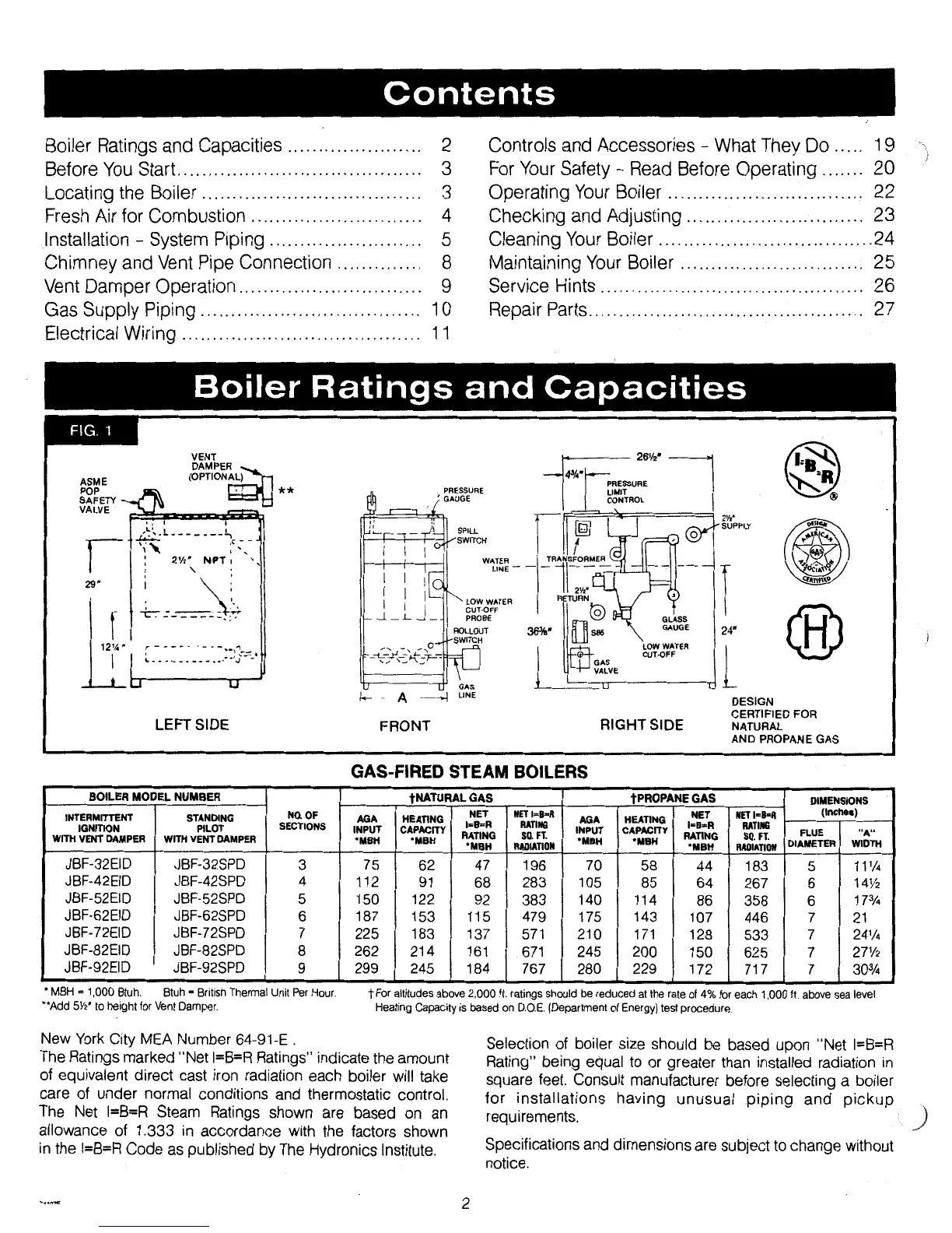 Crown Boiler JBF-EID - Contents; Boiler Ratings and Capacities
