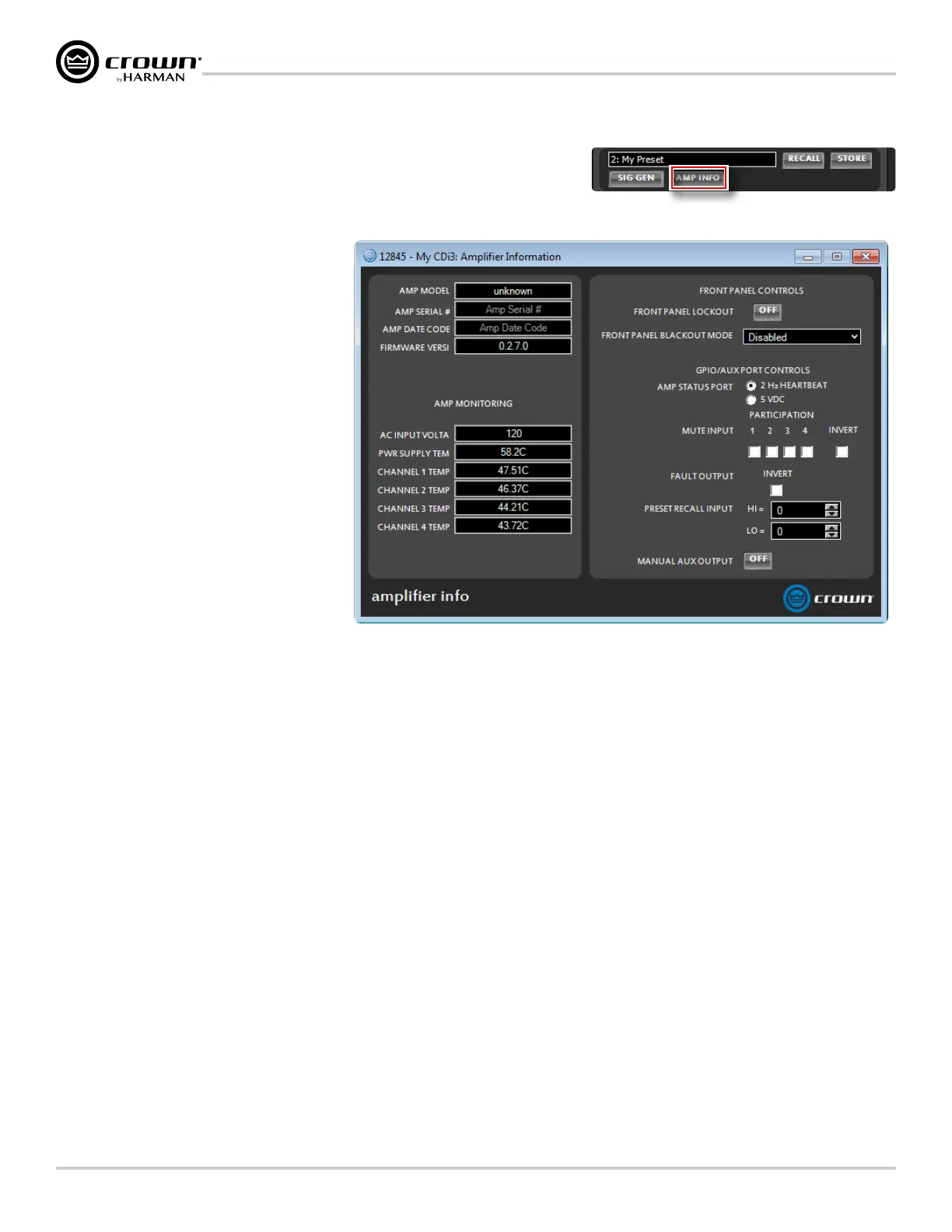 control inputs. This button can be controlled from its default loacation on the Amp Info panel, from a user-created custom control panel, using logic