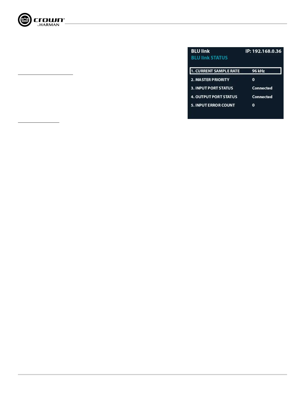 Indicates whether or not an valid BLU link connection has been made to the BLU link input port. Under normal operating conditions, "Connected" will