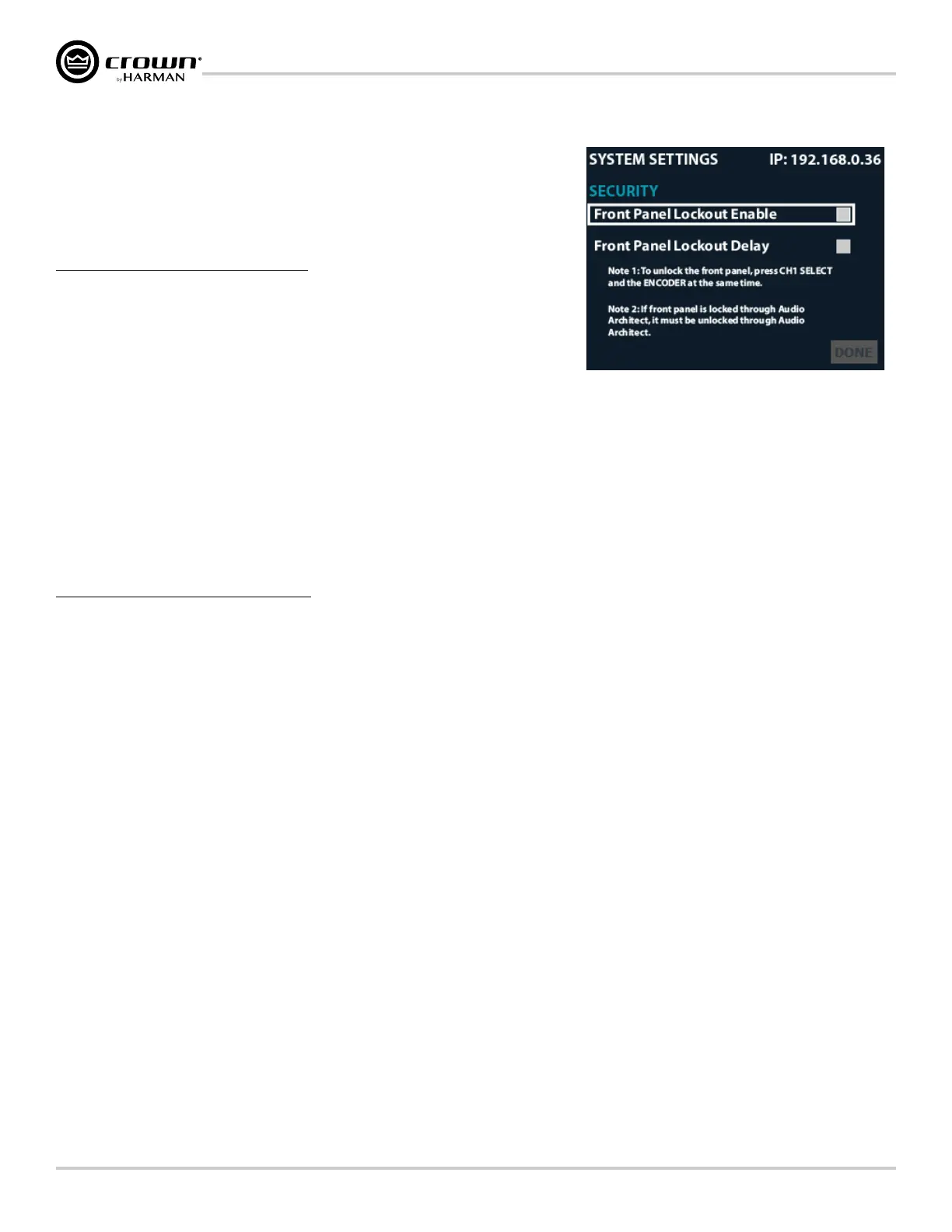 5� Using the ENCODER, select "Done" at the bottom of the screen. If the "Front Panel Lockout Delay" option was not enabled, a prompt will immediately