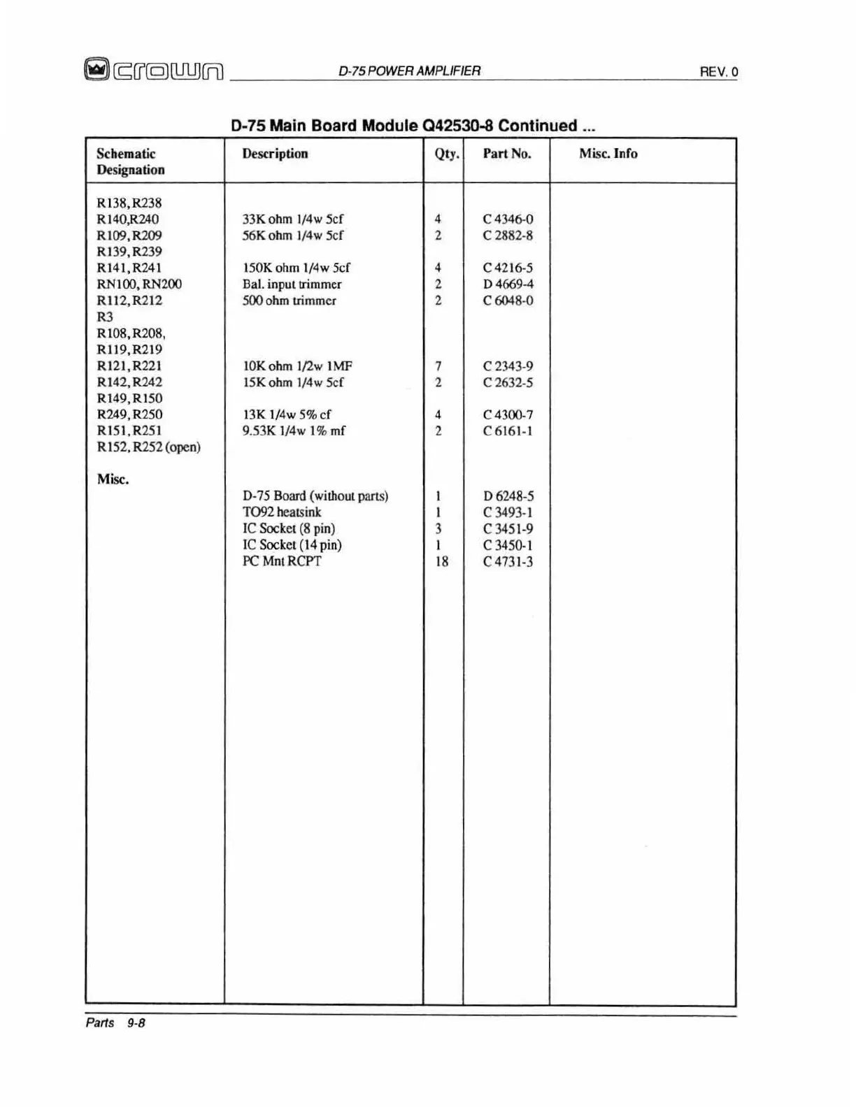 Description Qly. Part No. Misc