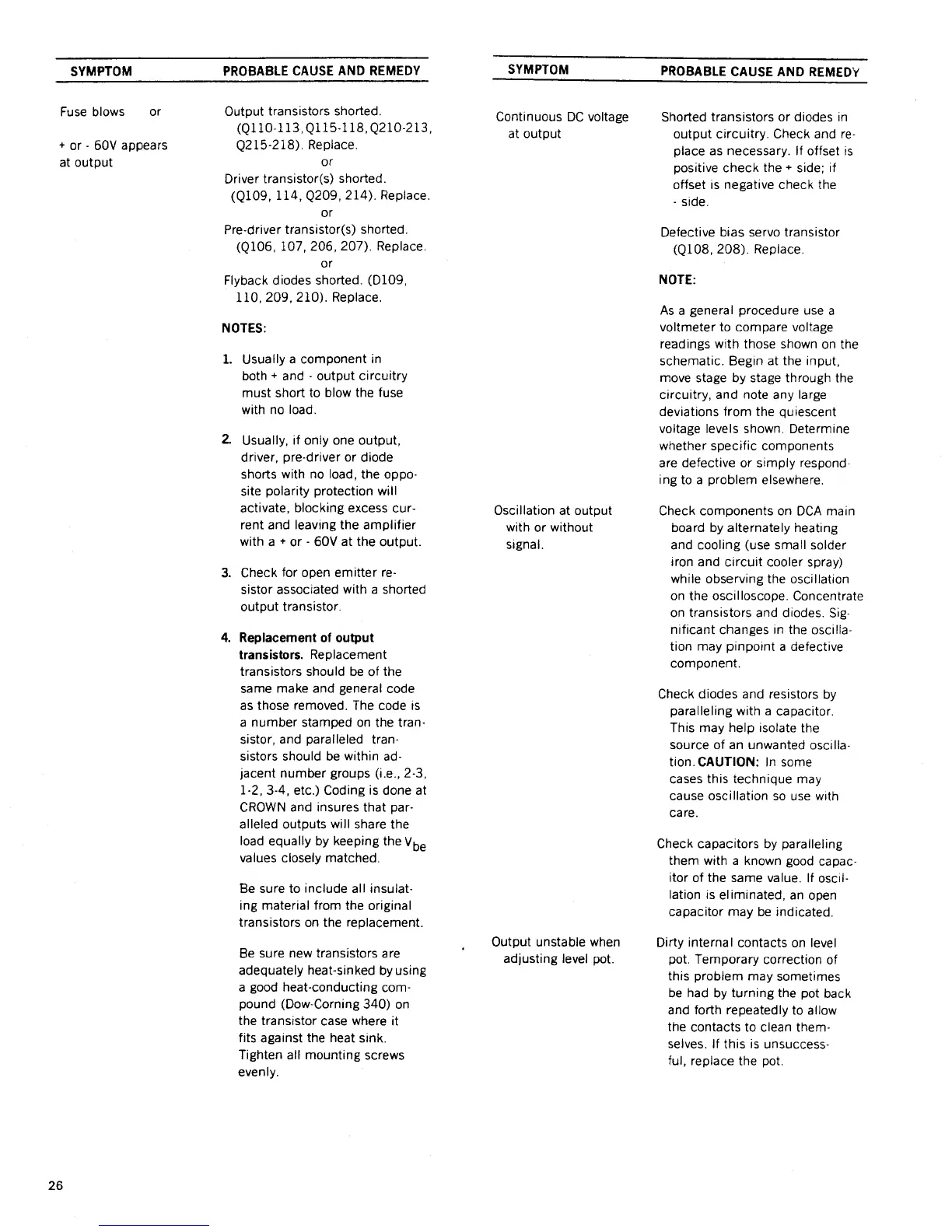 Crown DC-300A - Fuse Blows or + or -60 V Appears at Output; Continuous DC Voltage at Output; Oscillation at Output with or Without Signal; Output Unstable When Adjusting Level Pot