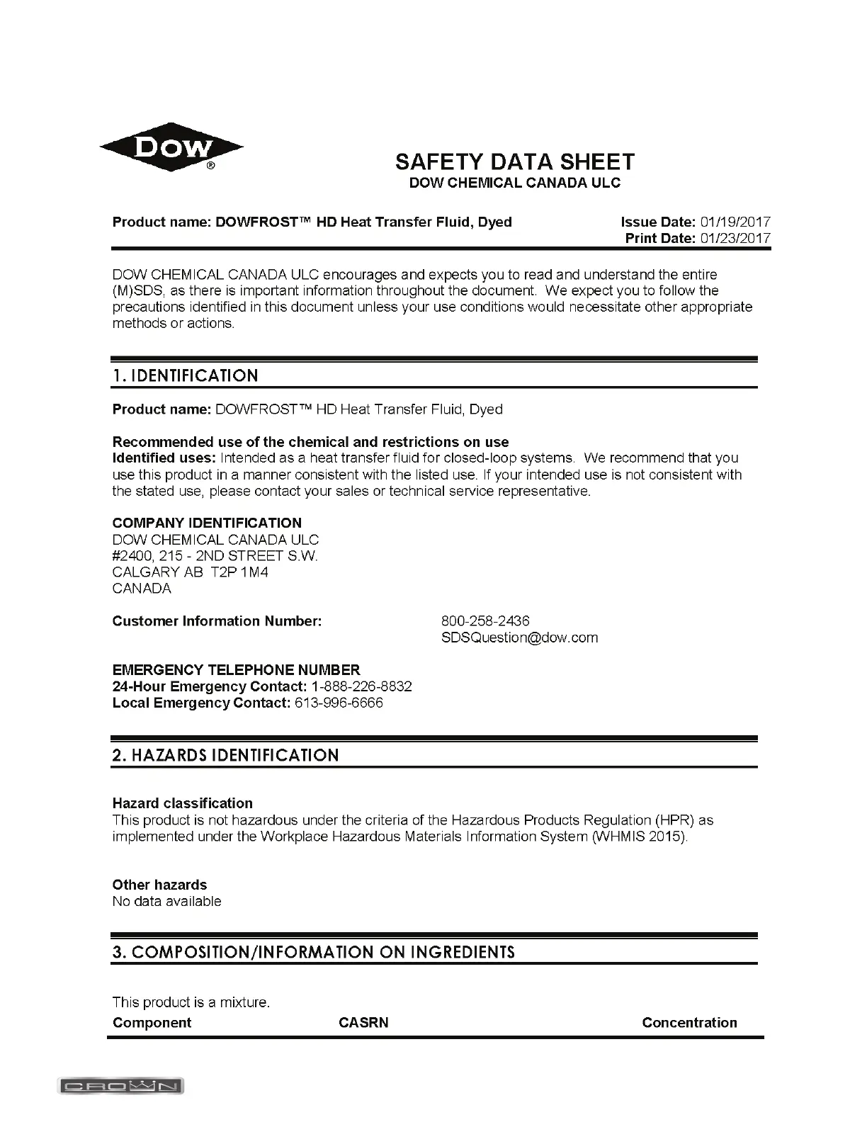 Crown EL - Material Safety Data Sheet (MSDS) Summary; Identification, Hazards, First Aid, Firefighting