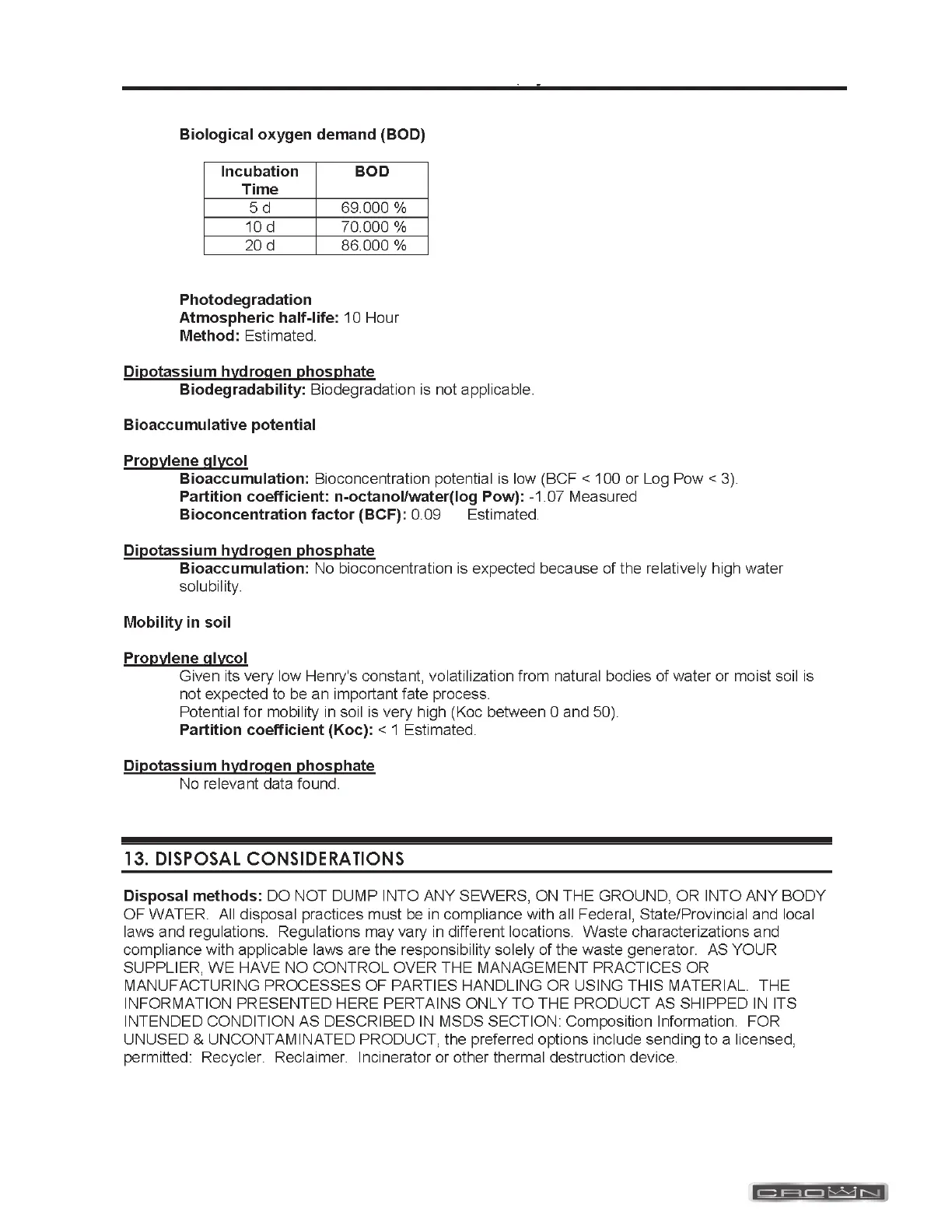 Crown EL - Disposal, Transport, Regulatory, Other Info