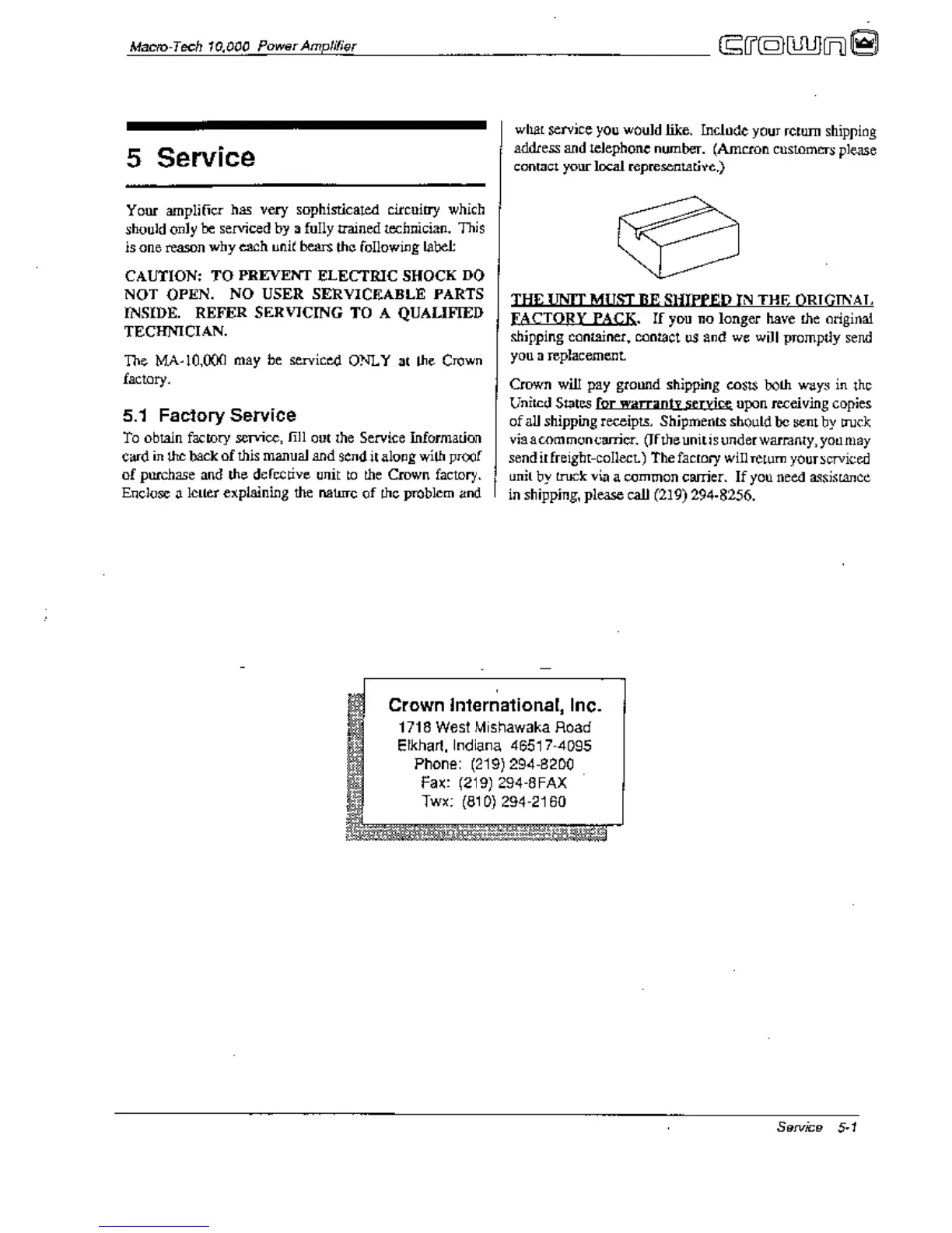 Crown Macro-Tech MA-10000 - Service; Factory Service