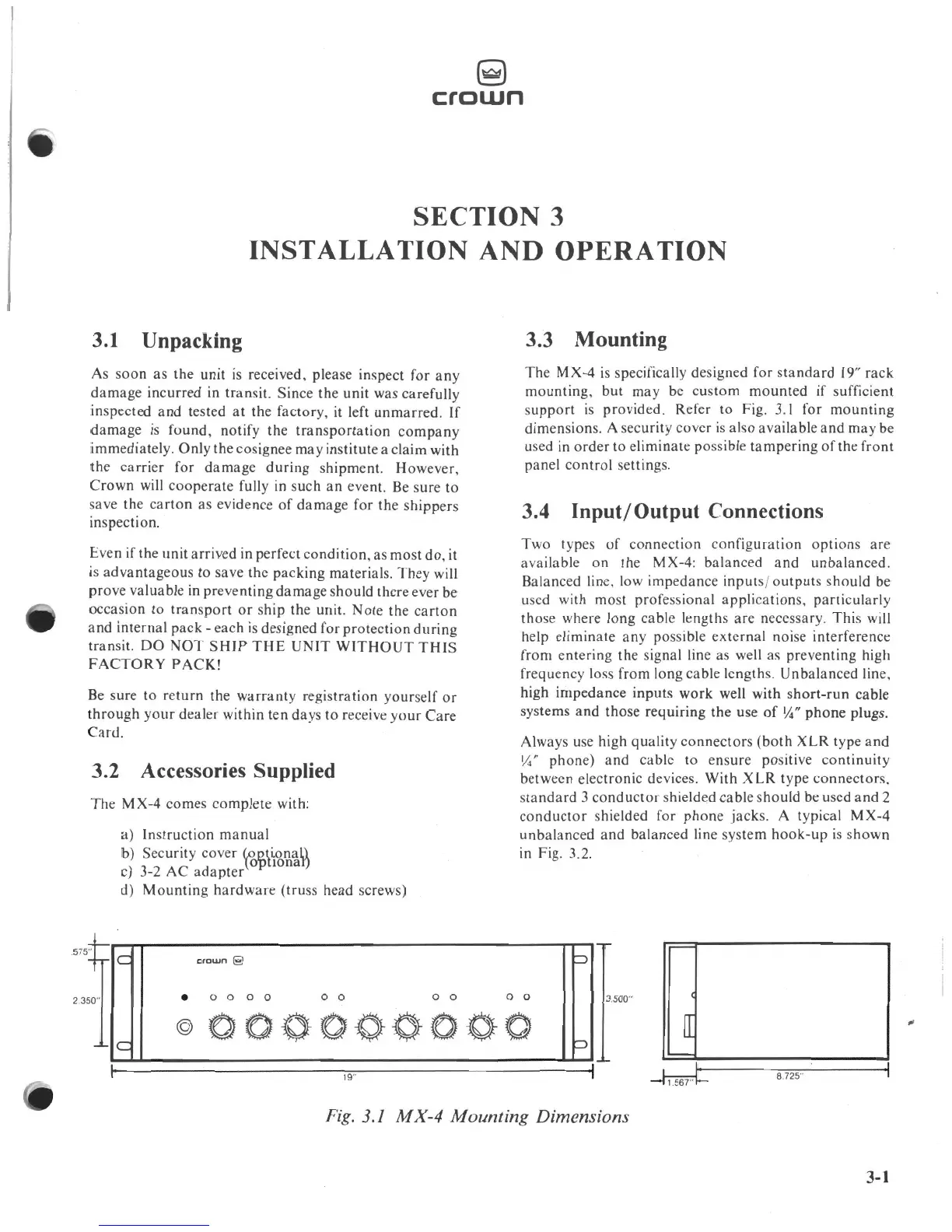 Crown MX-4 - SECTION 3 INSTALLATION AND OPERATION; 3.1 Unpacking; 3.2 Accessories Supplied; 3.3 Mounting