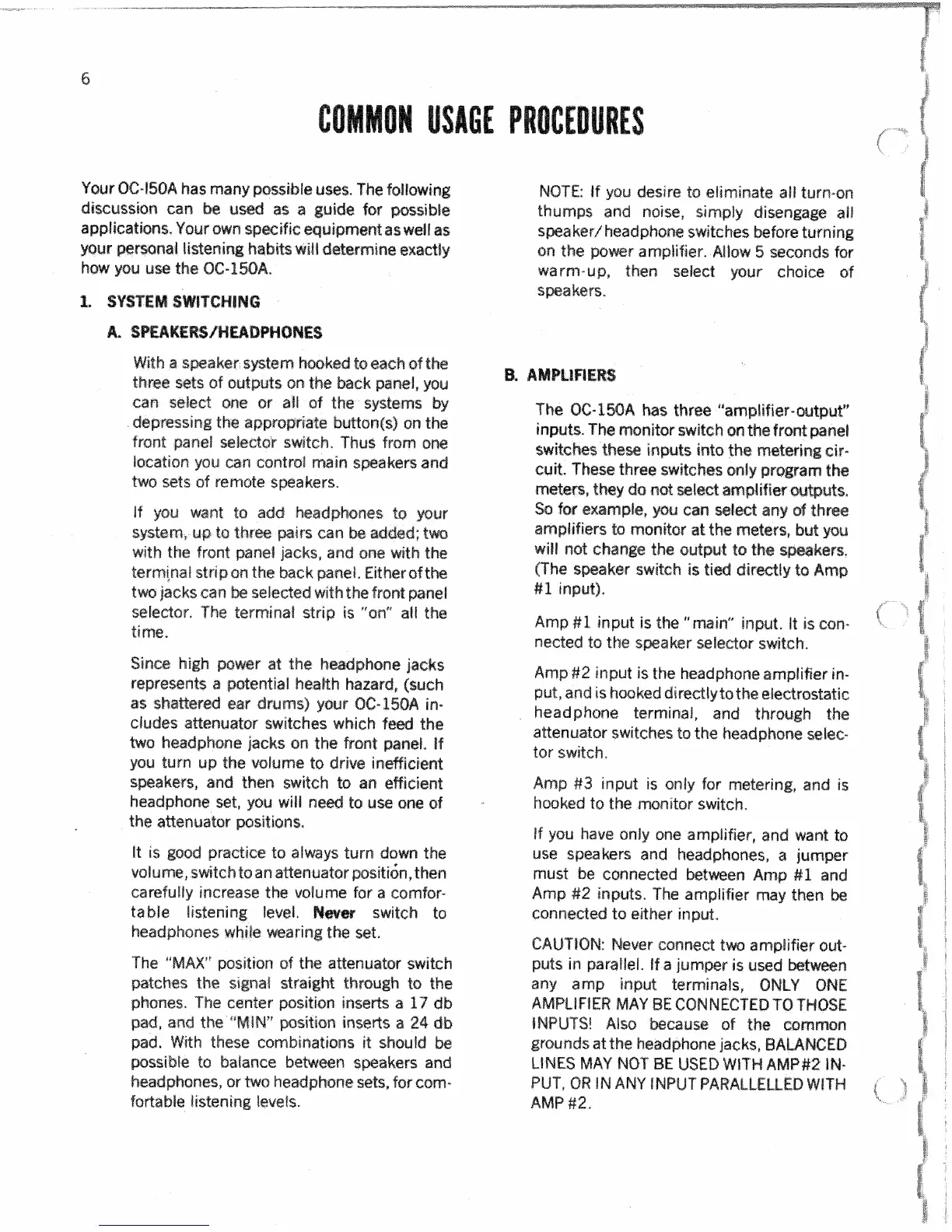 Crown OC-150A - Common Usage Procedures; System Switching for Speakers and Headphones; Amplifier Input Monitoring