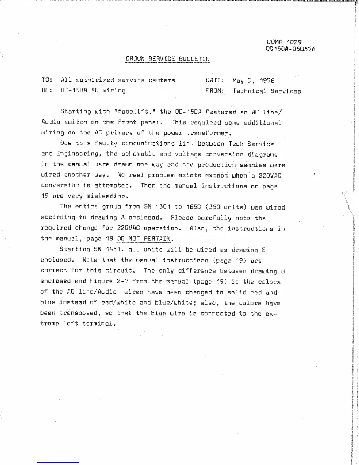 Crown OC-150A - Service Bulletin: OC-150 A AC Wiring