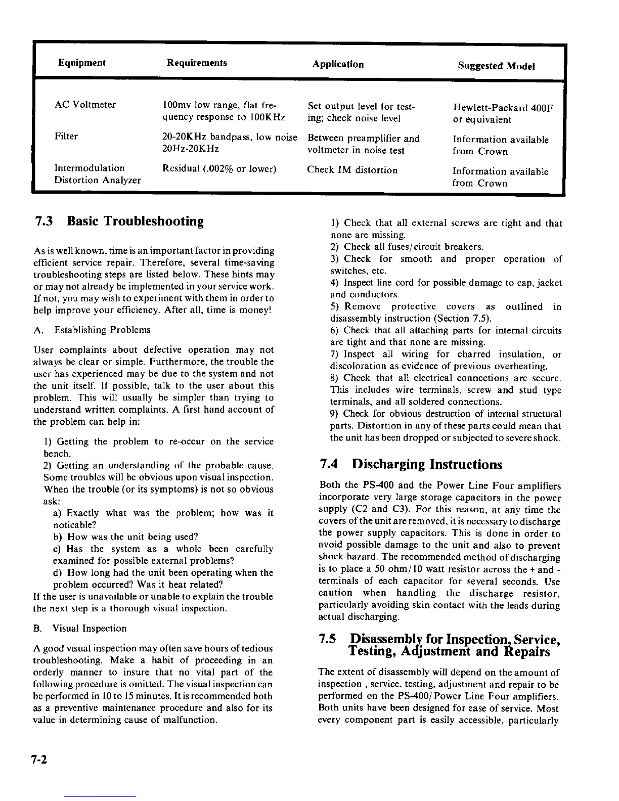 Crown PL-4 - Basic Troubleshooting; Establishing Problems; Discharging Instructions; Visual Inspection