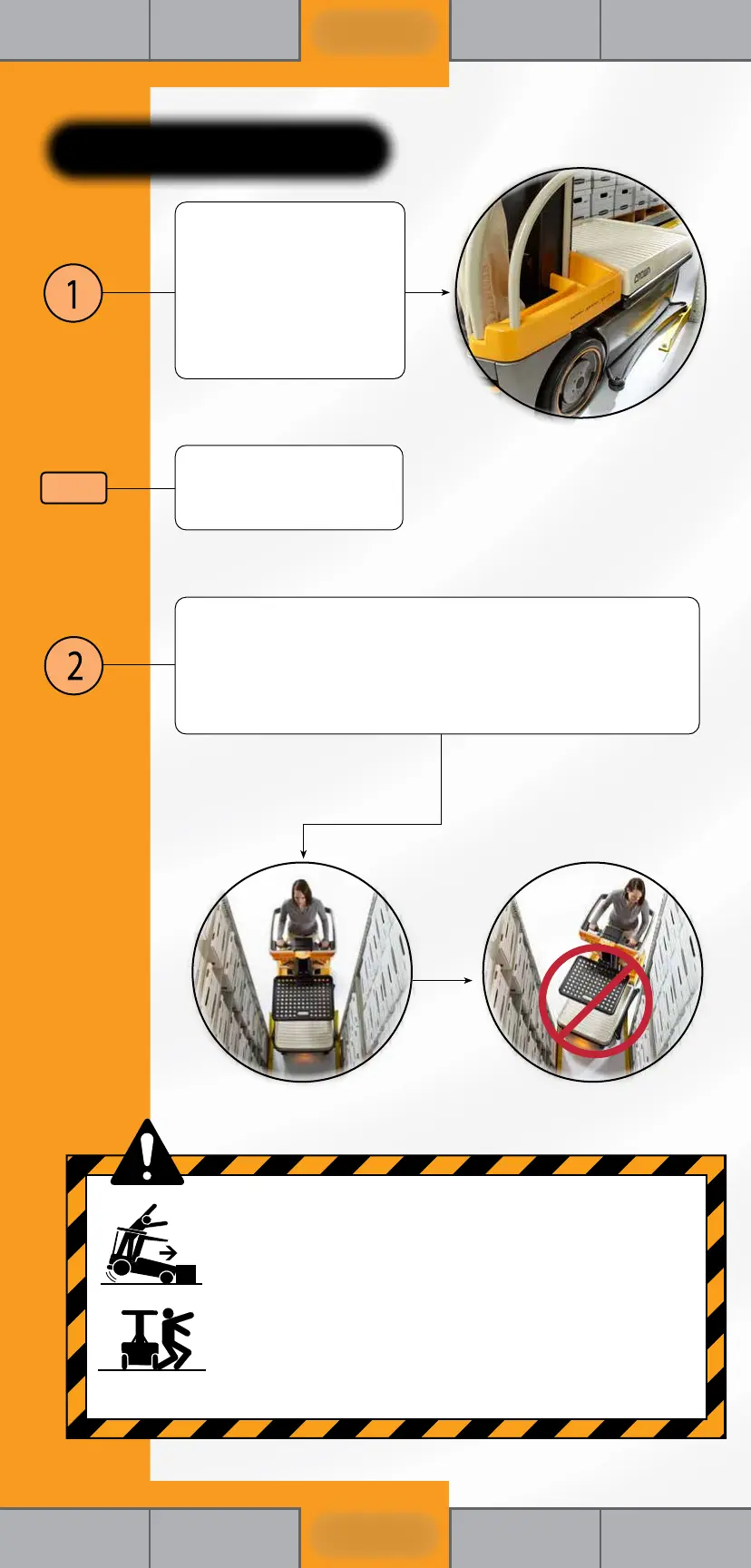 Drive straight into and out of aisles. Do not approach or