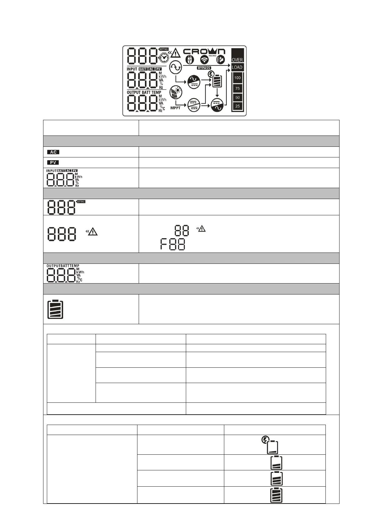 Indicate input voltage, input frequency, PV voltage, charger current,