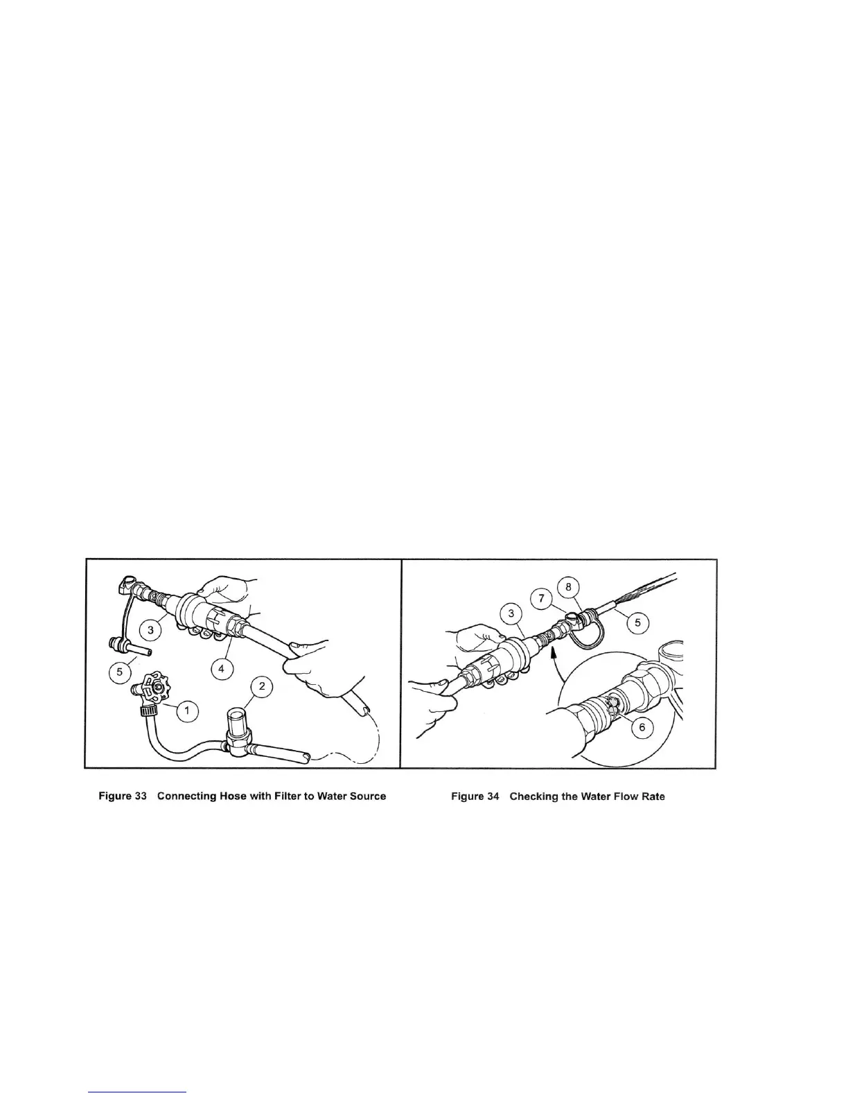 1. Connect the water hose with the built-in screen filter (2) to the water faucet (1) (Figure 33). See following CAUTION.