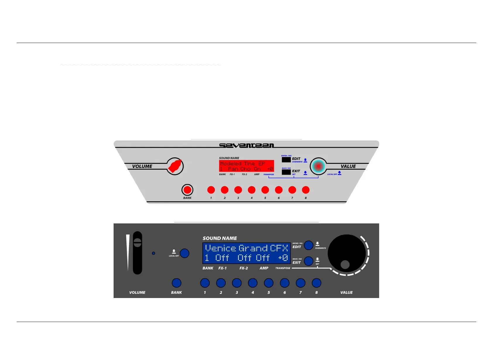 performance controls like volume or presets selection to deep editing of the sounds and global setting of the instrument. The front
