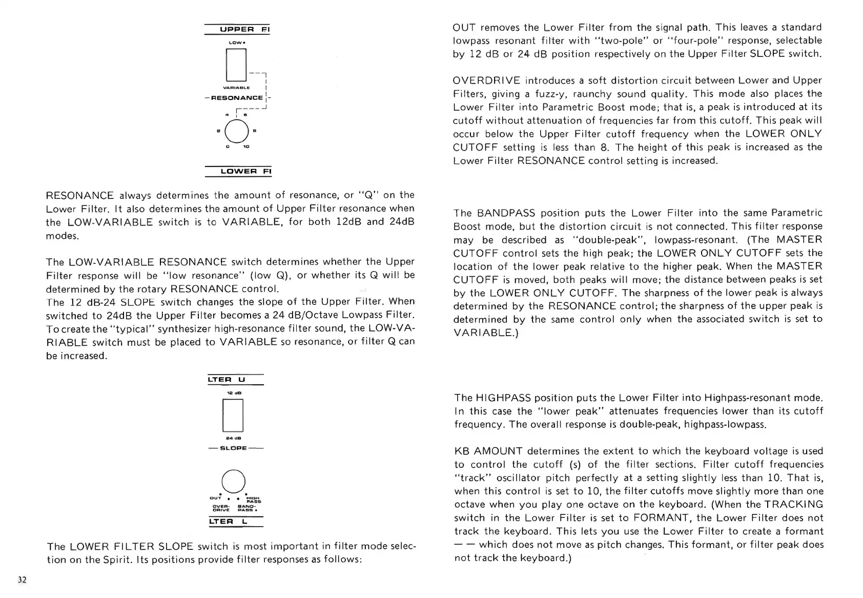 Crumar Spirit - Filter Resonance and Tracking; Resonance, Slope, and KB Amount