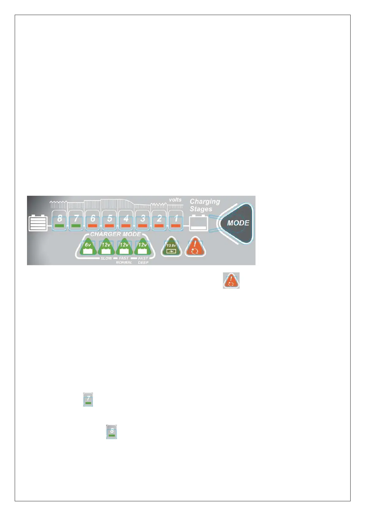 MODE för att välja önskat laddningsläge med hänsyn till batteriet som ska laddas. När batteriet anslutits kommer