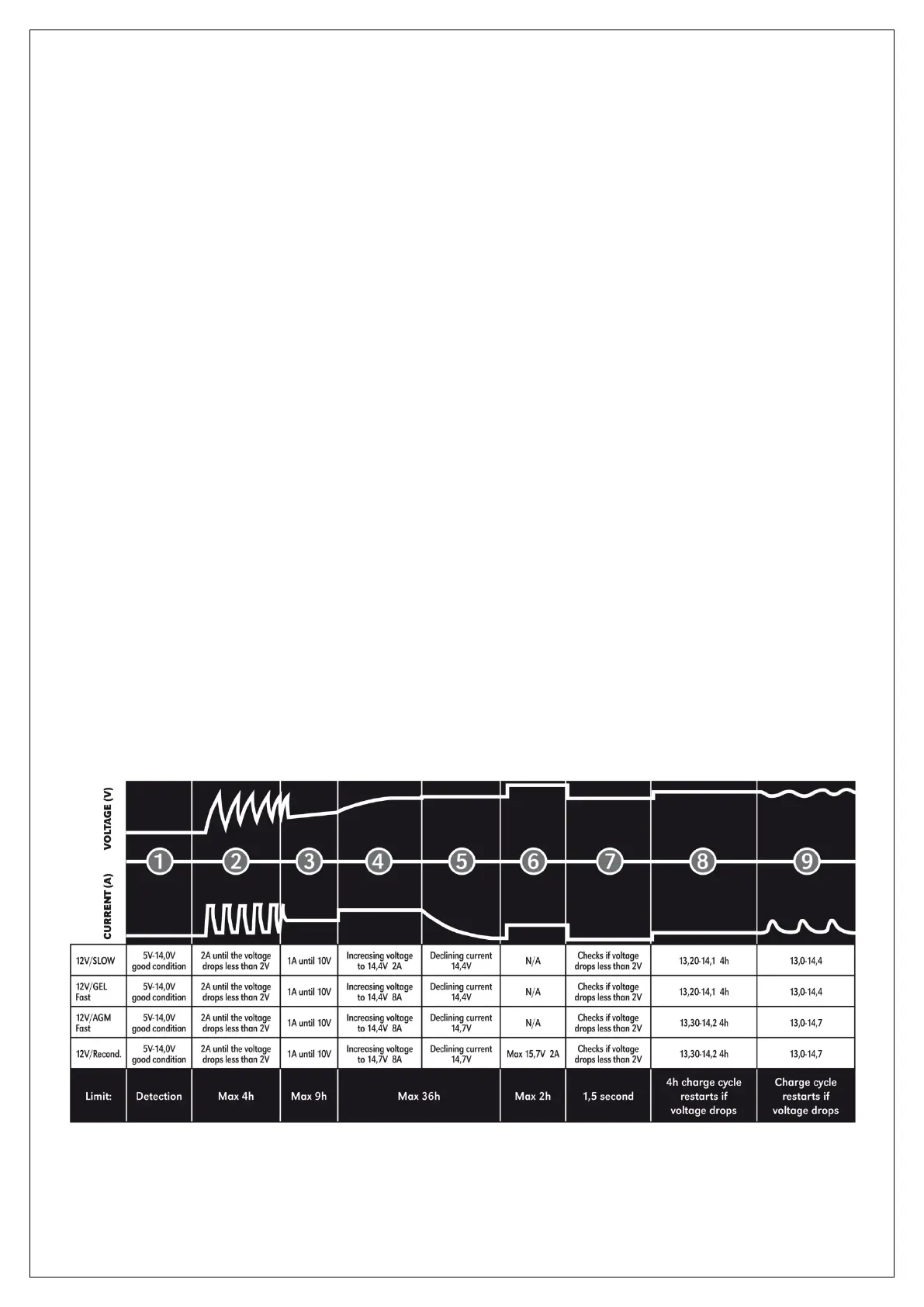 Soveltuu 12 V (10 - 120 Ah) tavallisille lyijyakuille, suljetuille akuille, vapaa-ajan akuille ja geeliakuille.