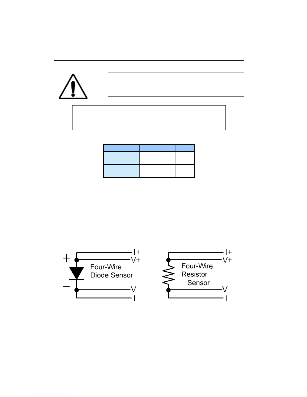 Four-wire connection to diode and resistive type sensors is diagrammed below: