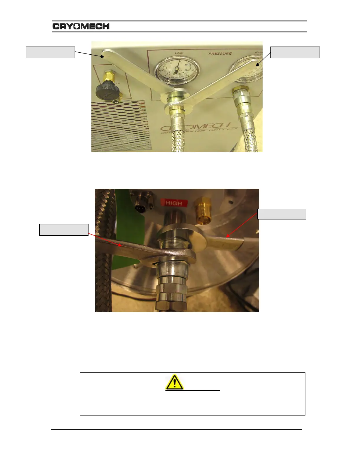 6) With the same wrenches, connect the other helium flex line to the high-pressure port