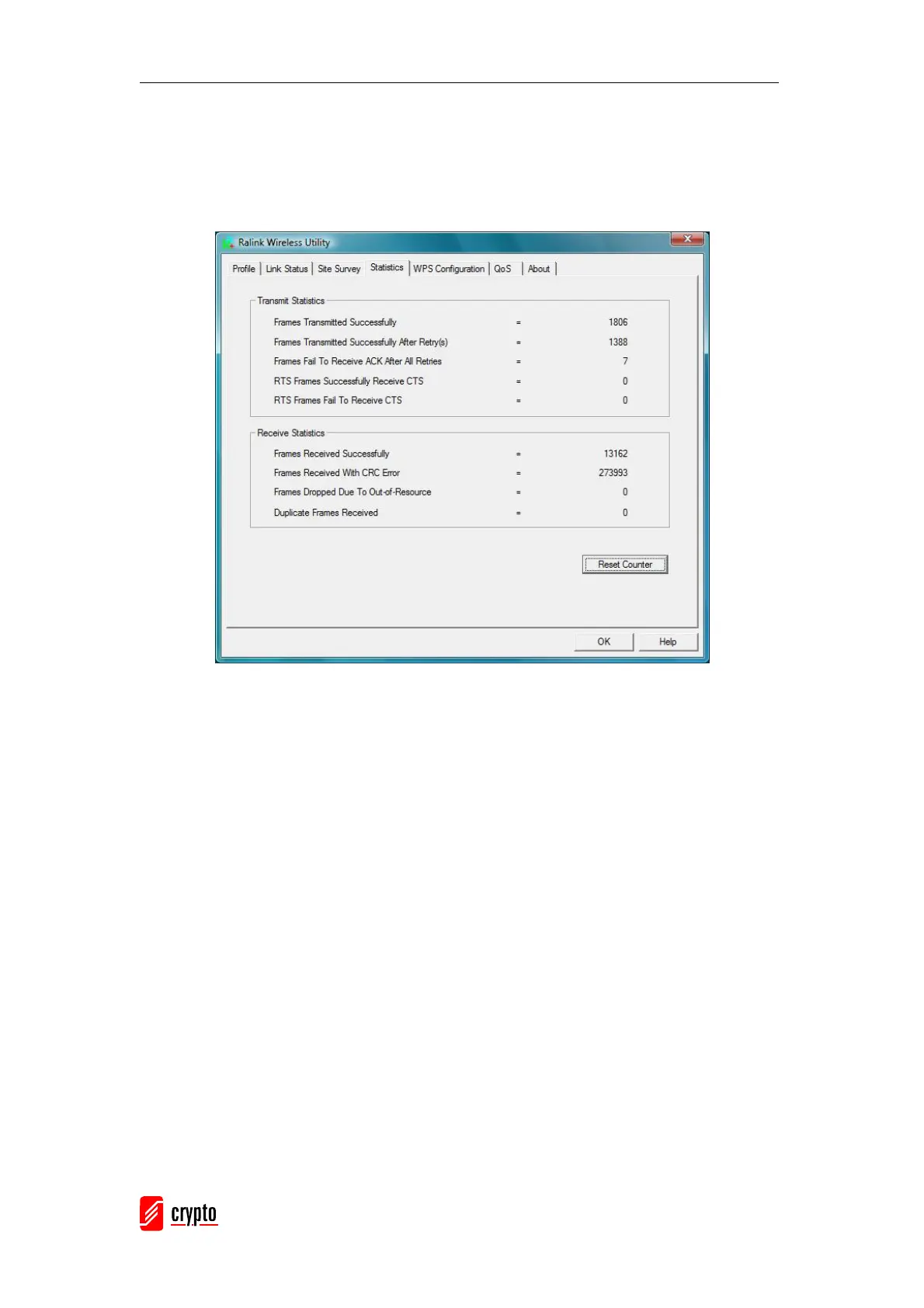 The statistics page displays the detail counter information based on 802.11 MIB counters.