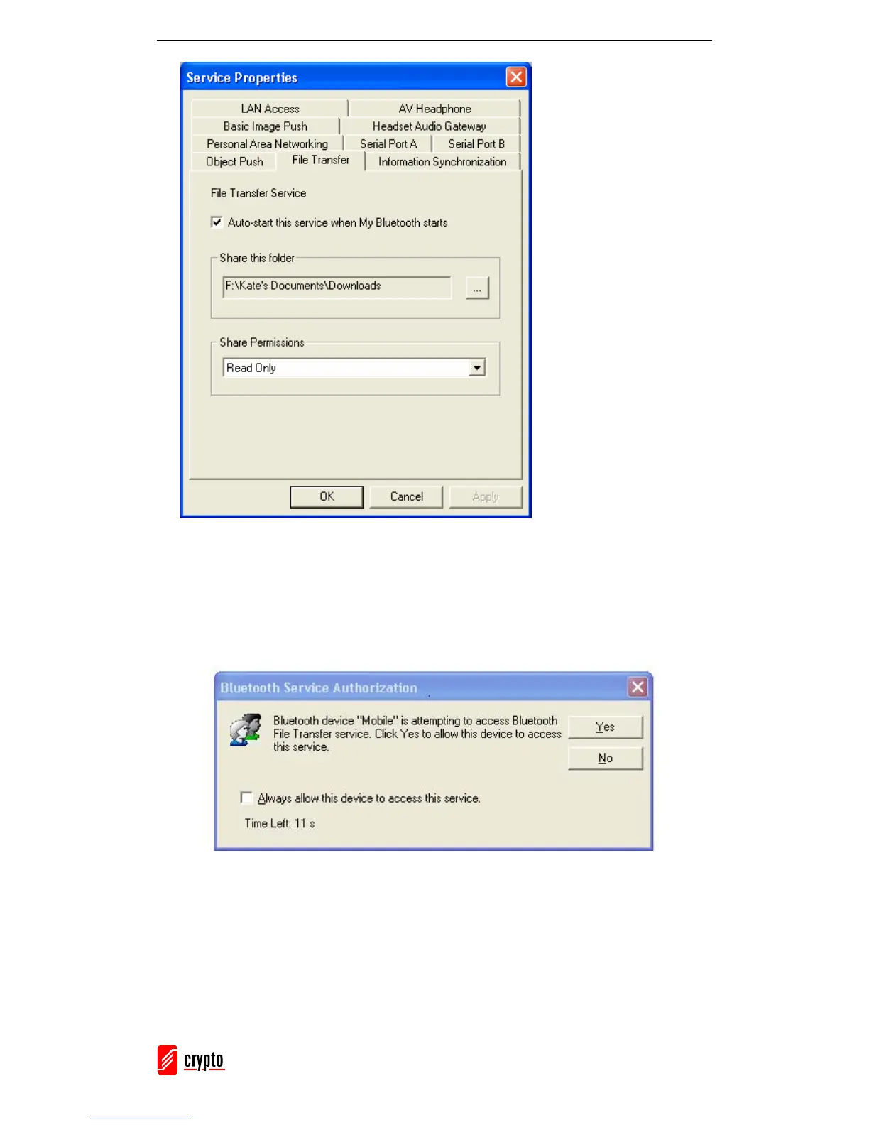 attempts to connect to your computer, the Bluetooth Service Authorization screen
