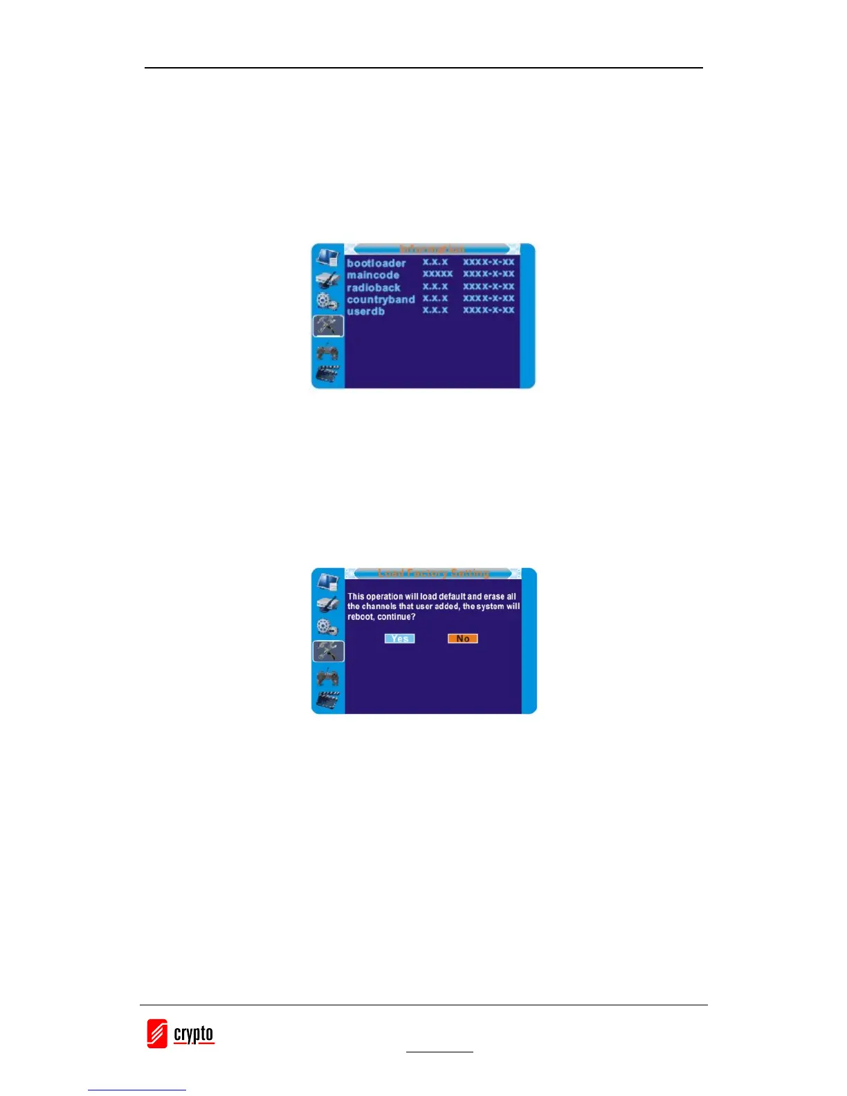 This menu can display some parameters of bootloader, maincode, radioback, countryband