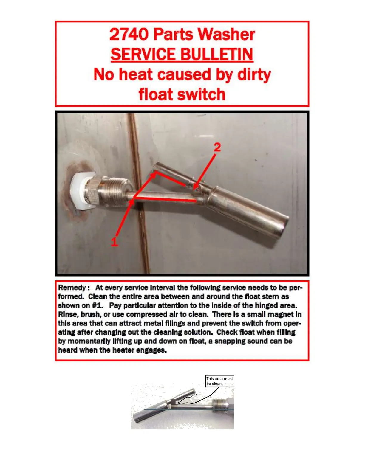 Crystal Clean 2740 - Service Bulletin: Float Switch Issue; Remedy for No Heat Condition
