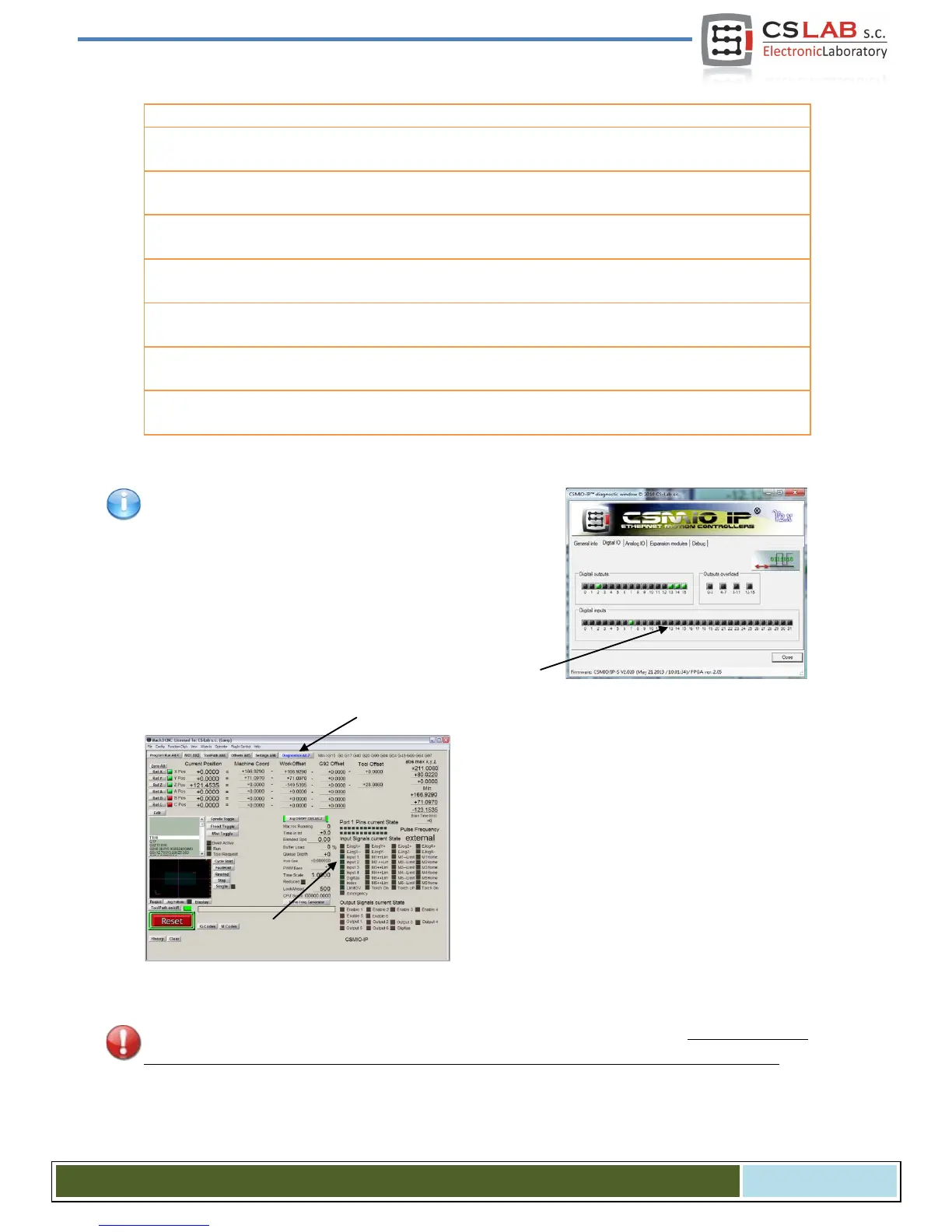 to the „Diagnostics” screen (top button bar in Mach3