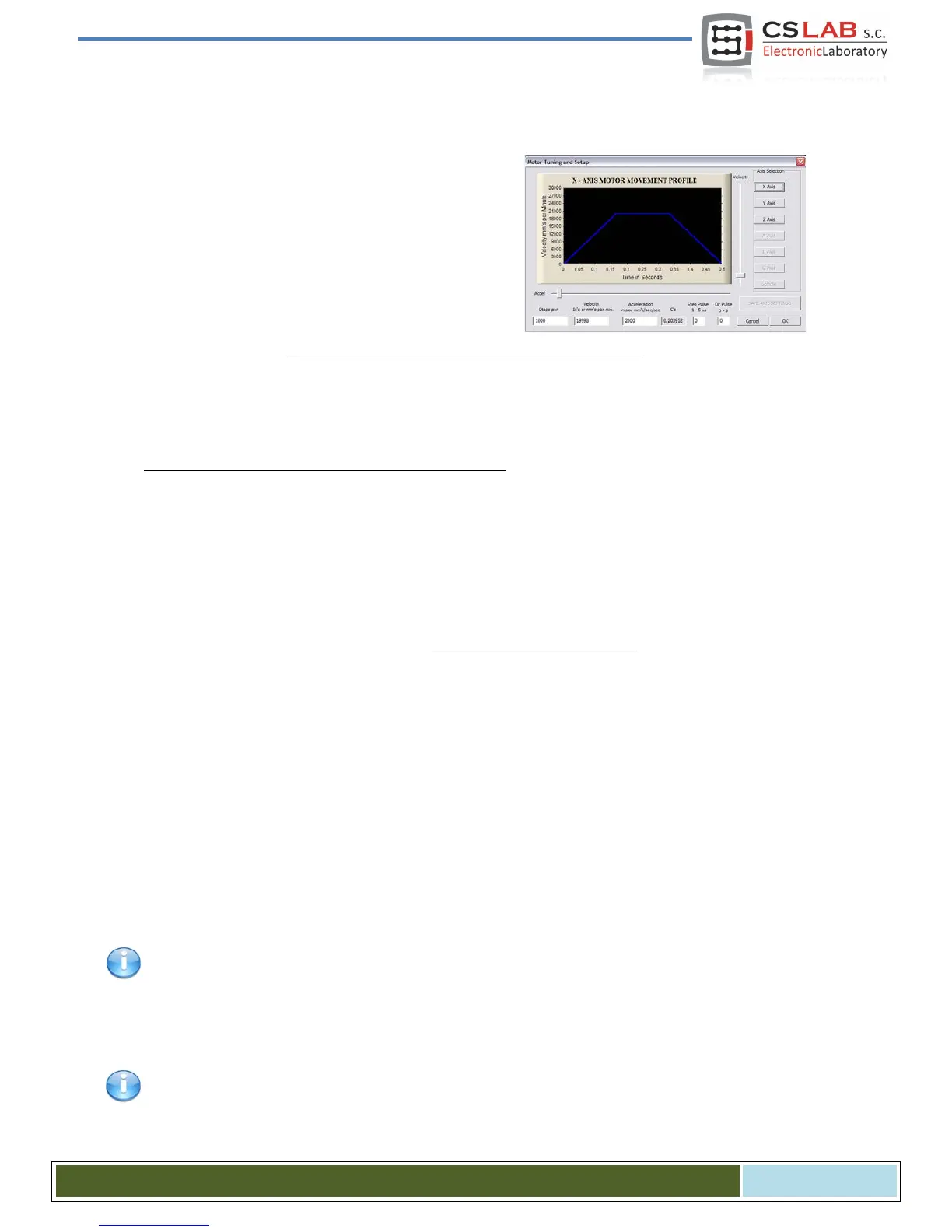 Open „Motor Tuning” window Select axis („Axis Selection”) Enter the parameters”SAVE AXIS SET-