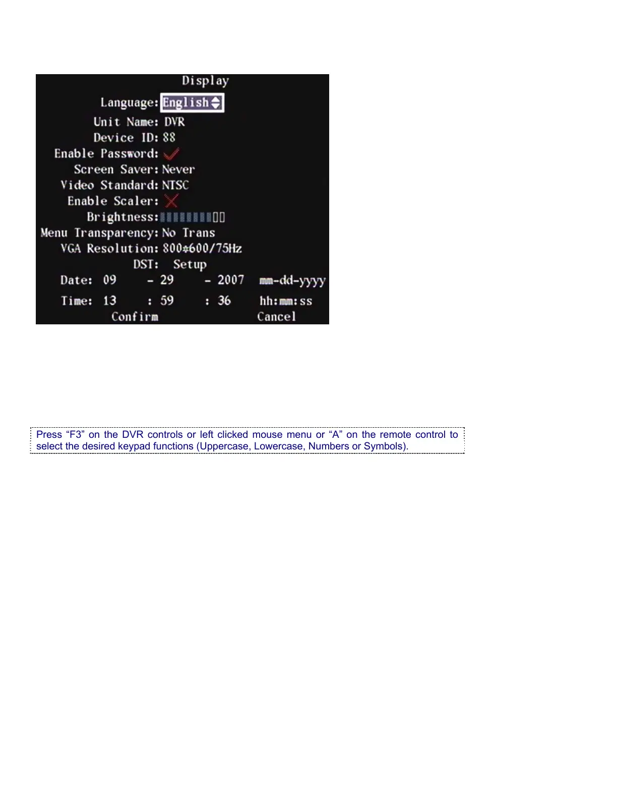 3. Use the DVR or remote control keypad or mouse menu to enter the Unit Name.