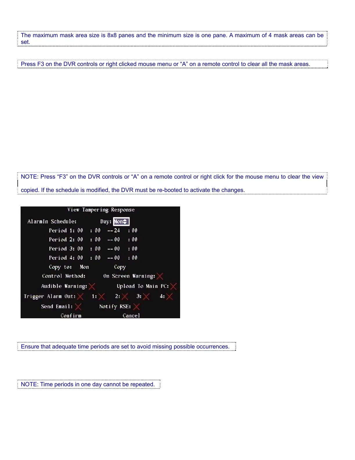 Press F3 on the DVR controls or right clicked mouse menu or “A” on a remote control to clear all the mask areas.