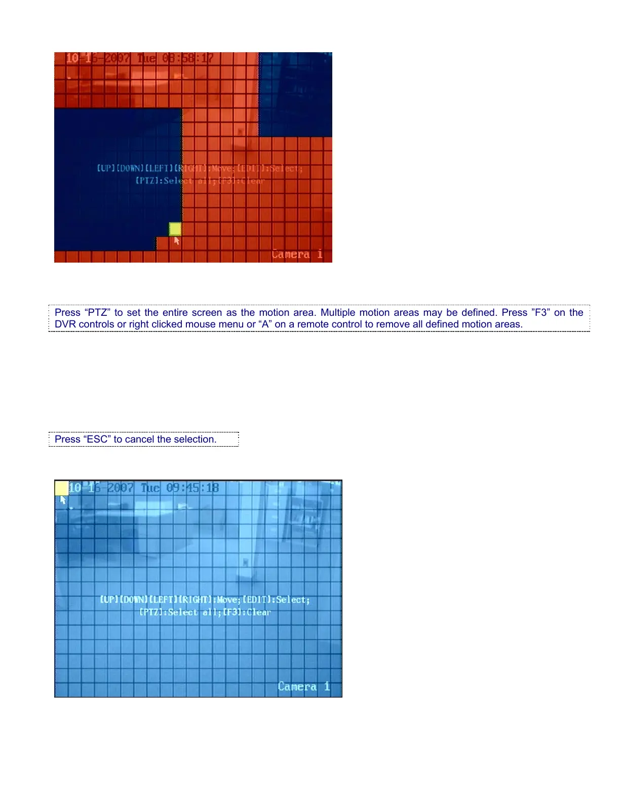 Press “PTZ” to set the entire screen as the motion area. Multiple motion areas may be defined. Press ”F3” on the