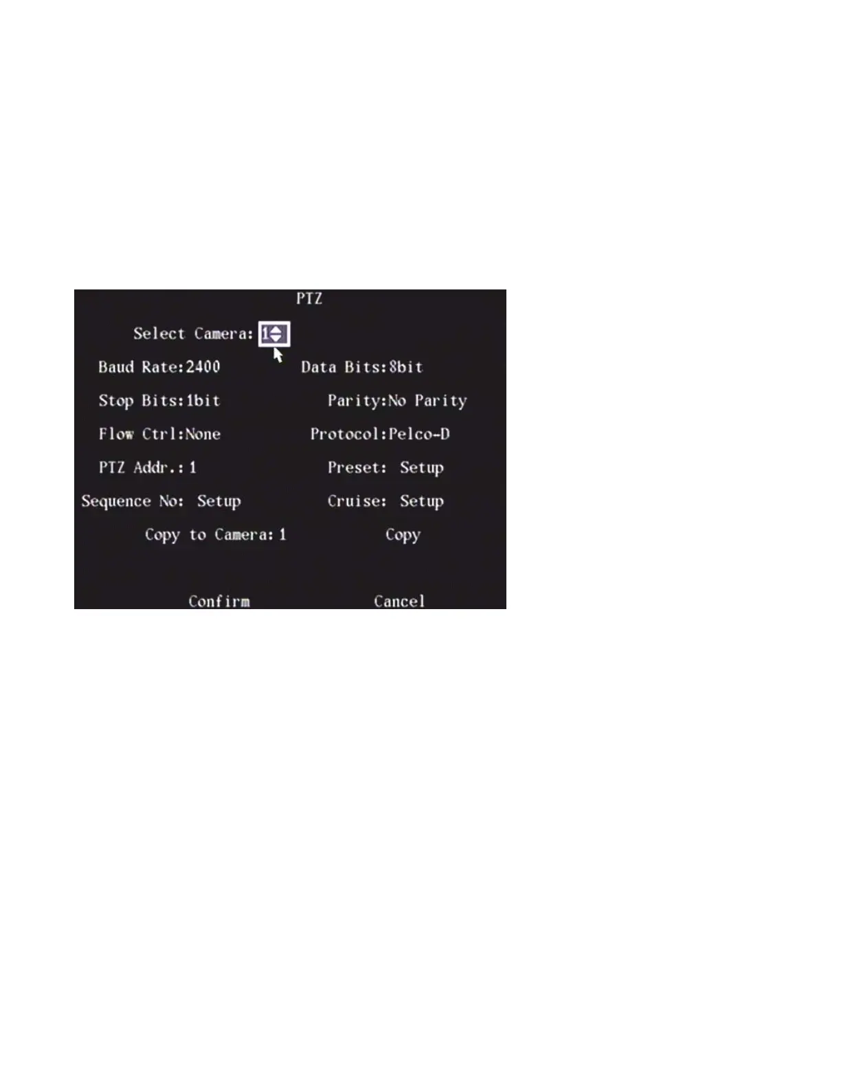 Select the camera number that a PTZ camera is connected to and configure it as follows: